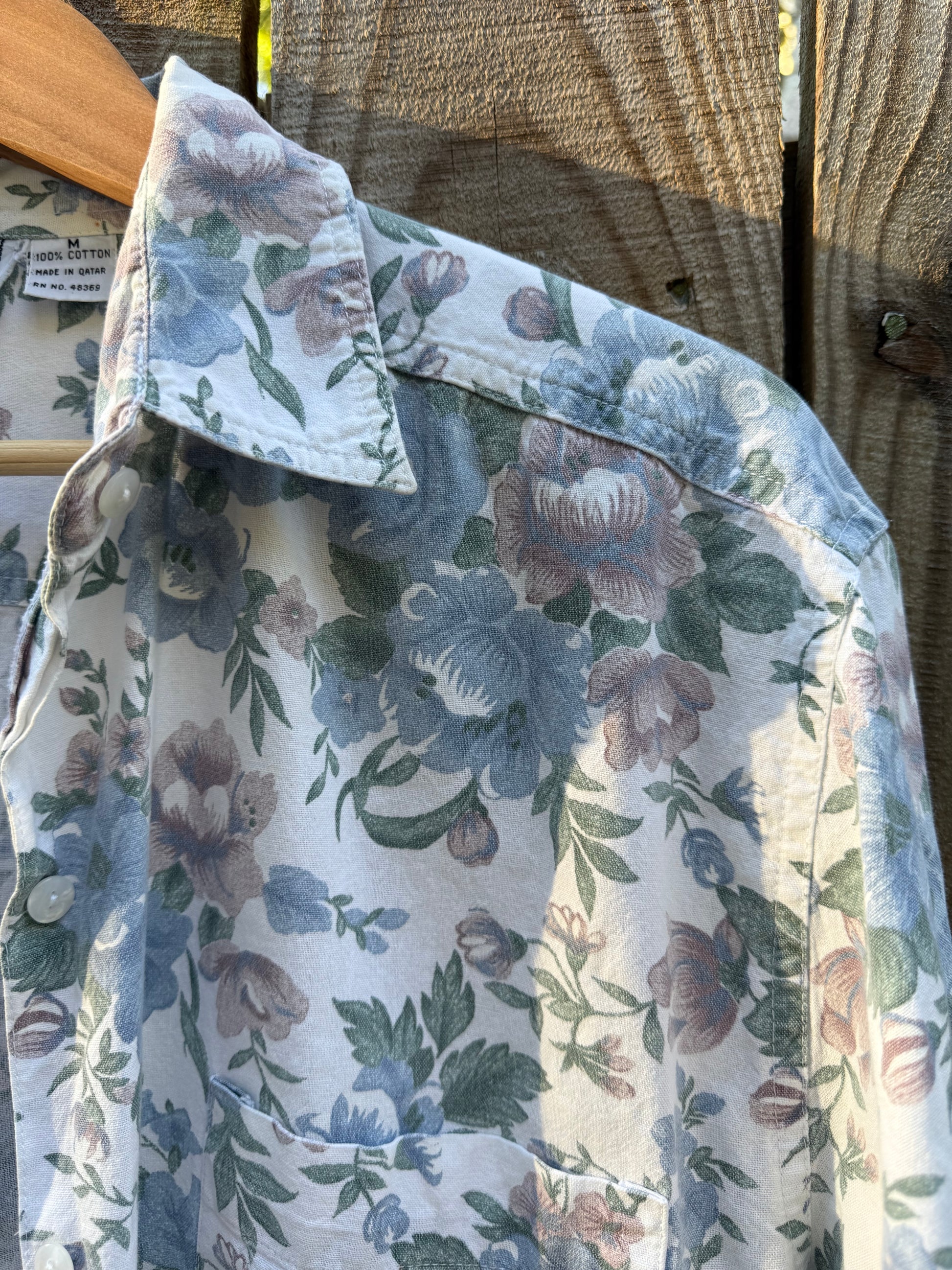 Keywords: vintage 80s shirt, oversized floral button down, true vintage cotton blouse, Kyoto Kasuals Qatar, pastel cottagecore shirt, romantic soft grunge top, coquette floral blouse, vintage layering shirt