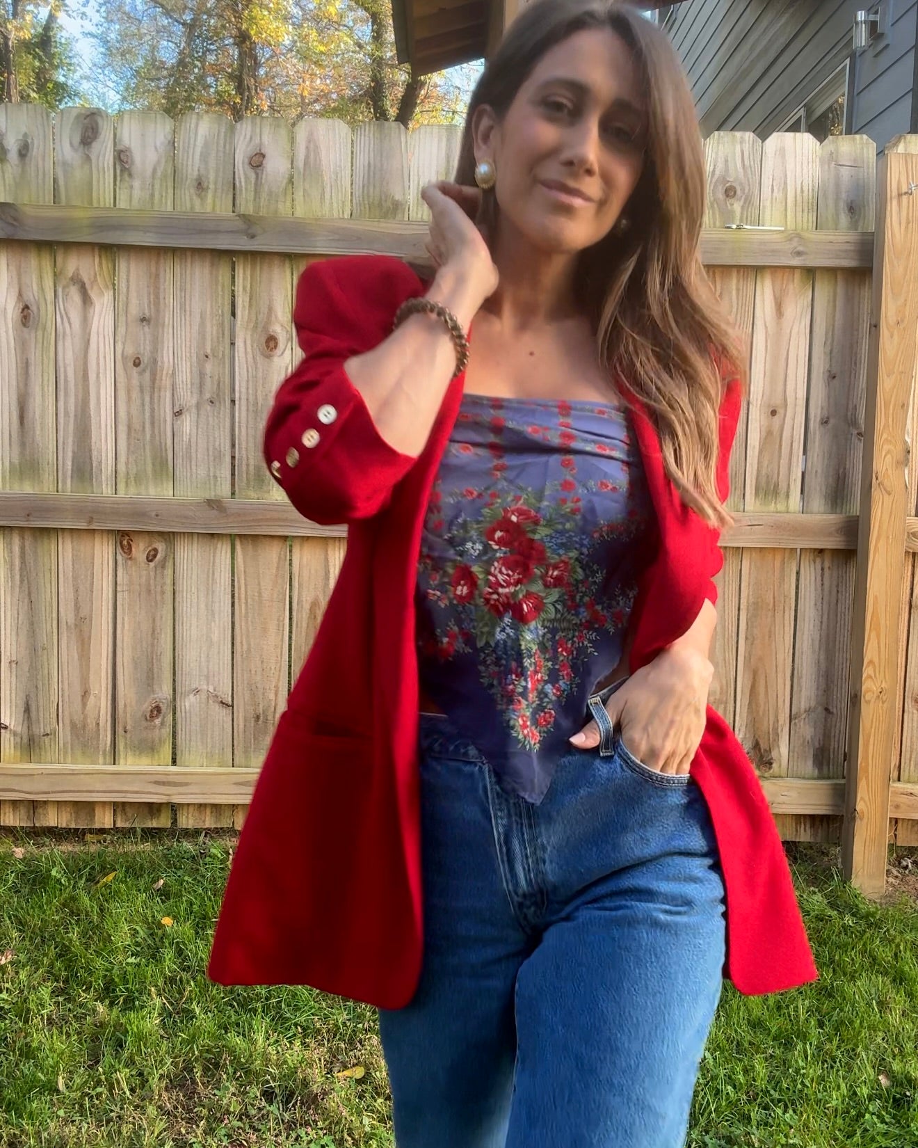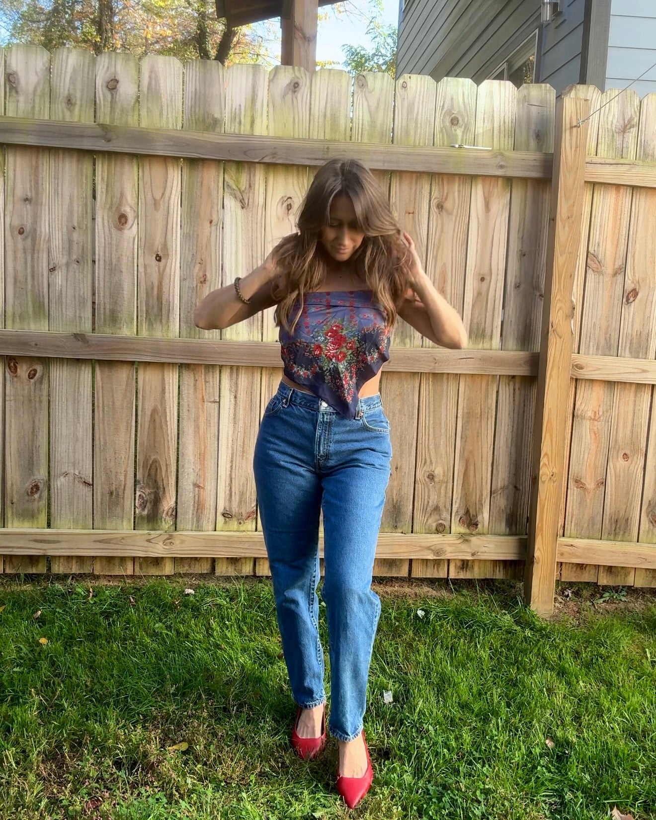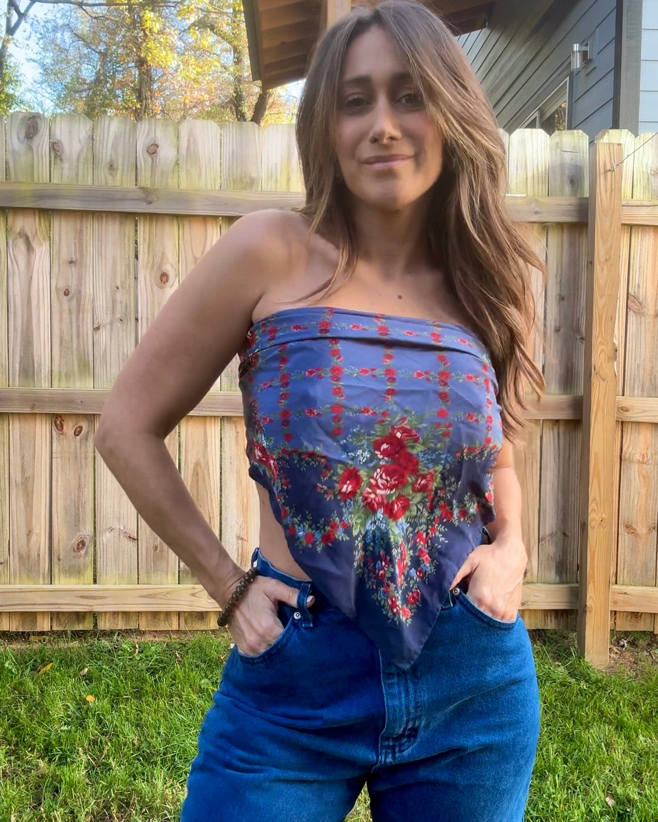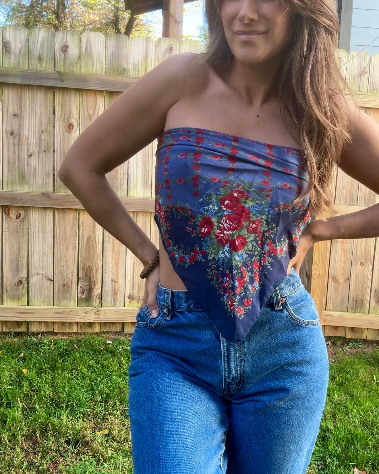 Silk vintage Laura Ashley scarf sourced from an estate sale — deep navy base with romantic floral print, the kind of textile that feels straight out of an old Italian holiday film. Styled here as a fresh modern strapless top — throw on a blazer and it hits full fashion editor energy. Also beautiful worn traditionally as a neck or hair scarf.