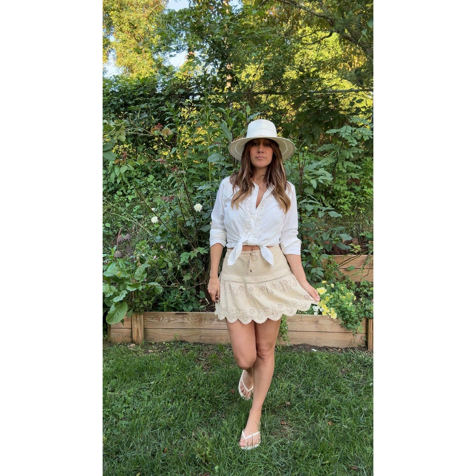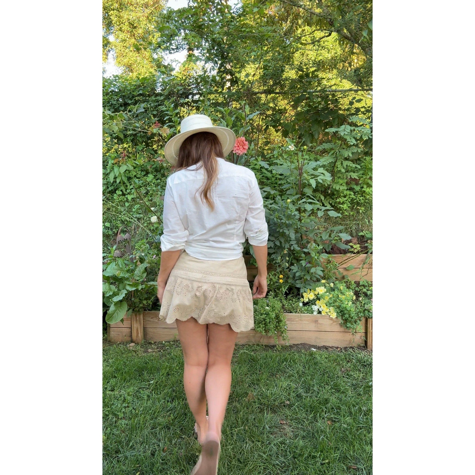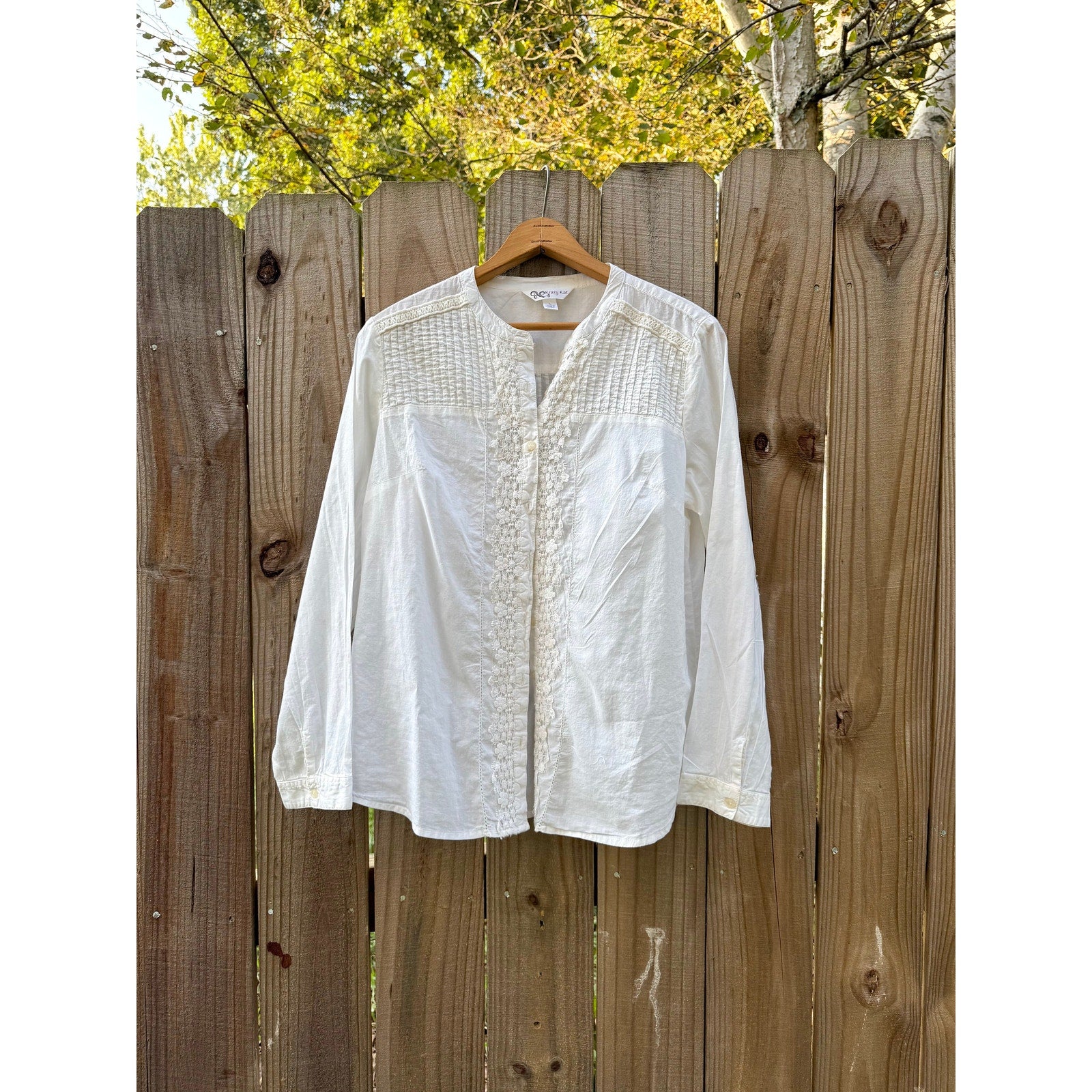 A romantic cotton blouse from the late ’90s/early 2000s, detailed with pintuck pleats and floral embroidery down the placket. Lightweight with a relaxed drape — wear tied at the waist for a modern Sunday Honey twist.
