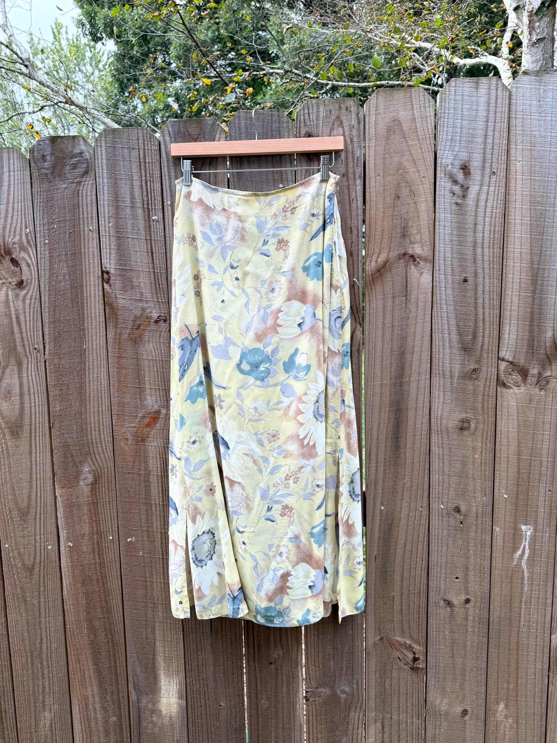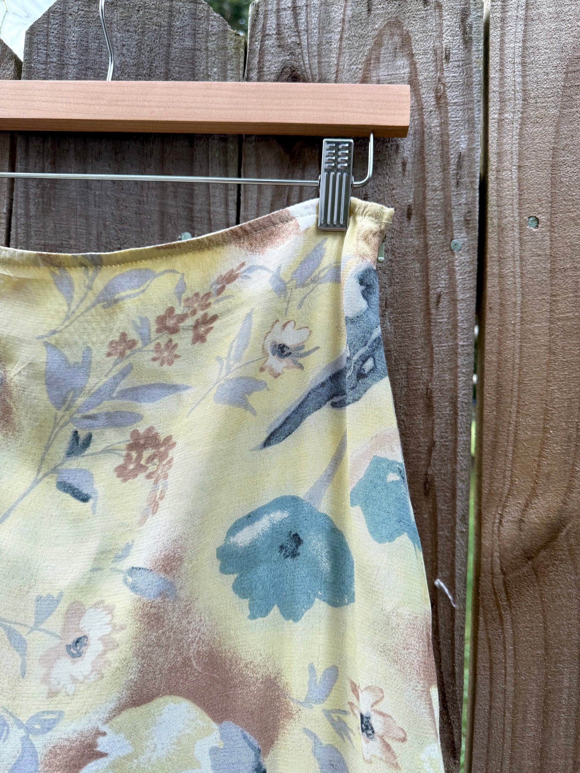 Soft lemon yellow with muted painterly florals, bias cut with a side slit. True 90s rayon with that drapey slip feel that’s trending again. Think: the easy femininity Reformation keeps reissuing, the coquette balletcore vibe Miu Miu has on every runway, and the clean, pared-back styling The Row uses to make pieces like this feel grown-up instead of girly.