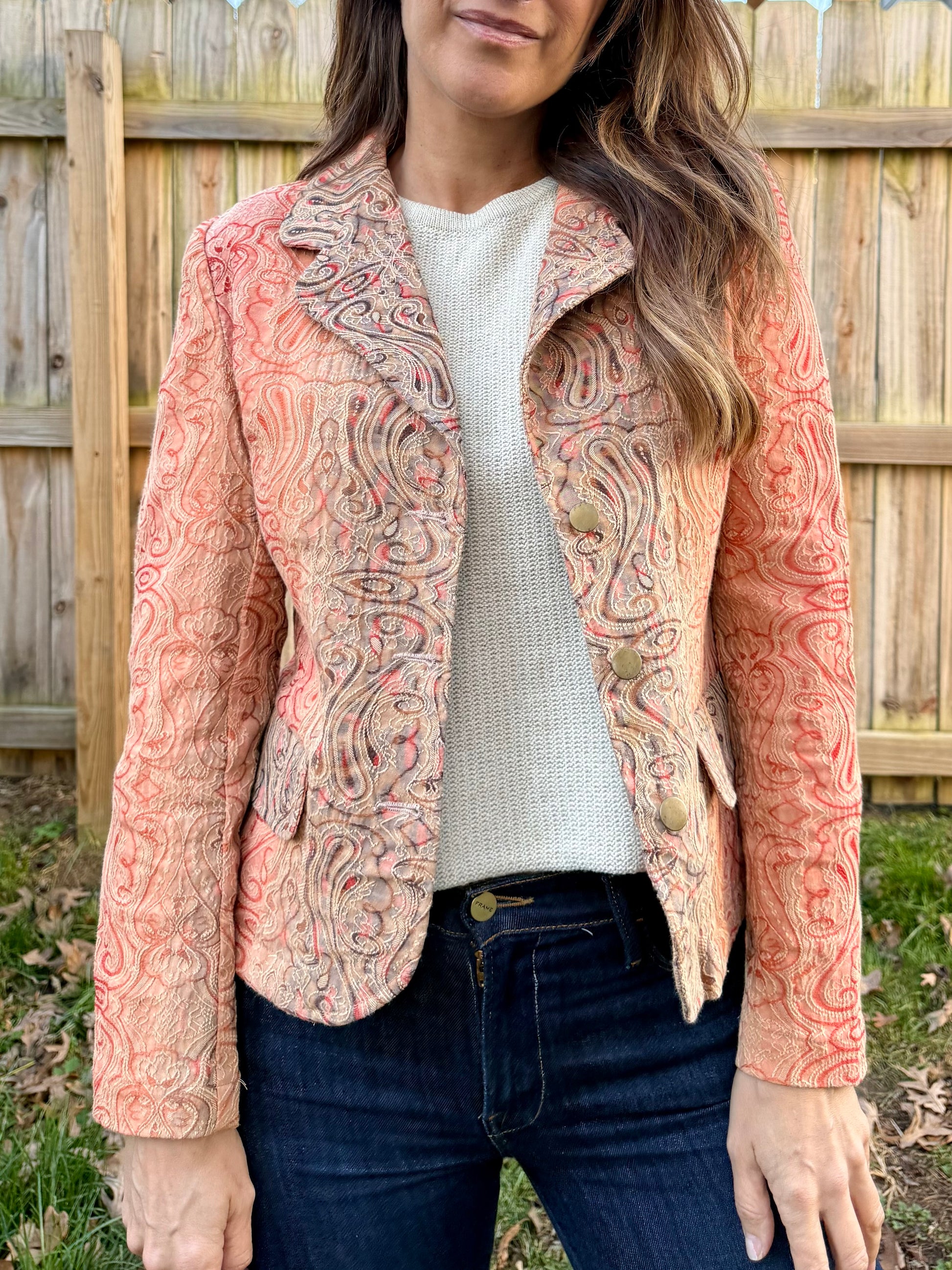 A true statement piece. Ornate paisley jacquard with a warm coral-rose base and subtle metallic depth that reads rich, not loud. The kind of blazer that feels collected, not trend-chasing — pulled for its texture, color story, and unmistakable early-2000s luxury mood.
