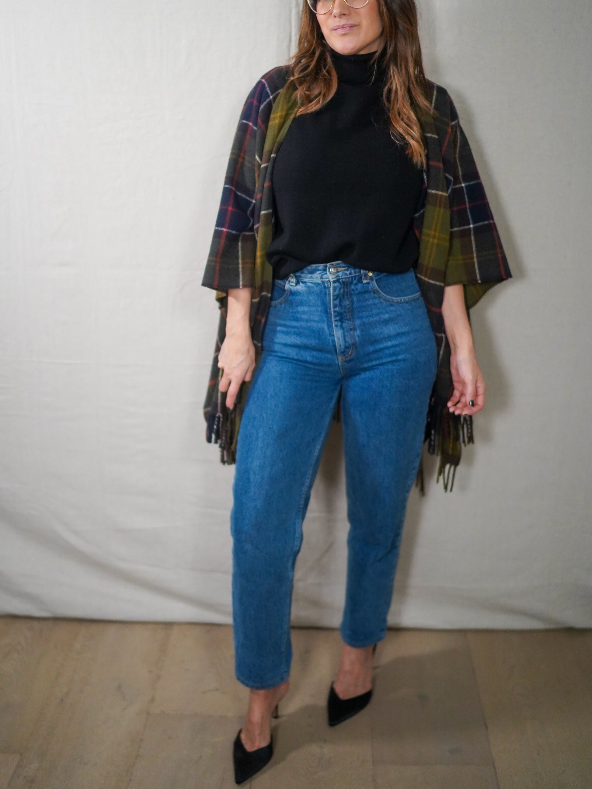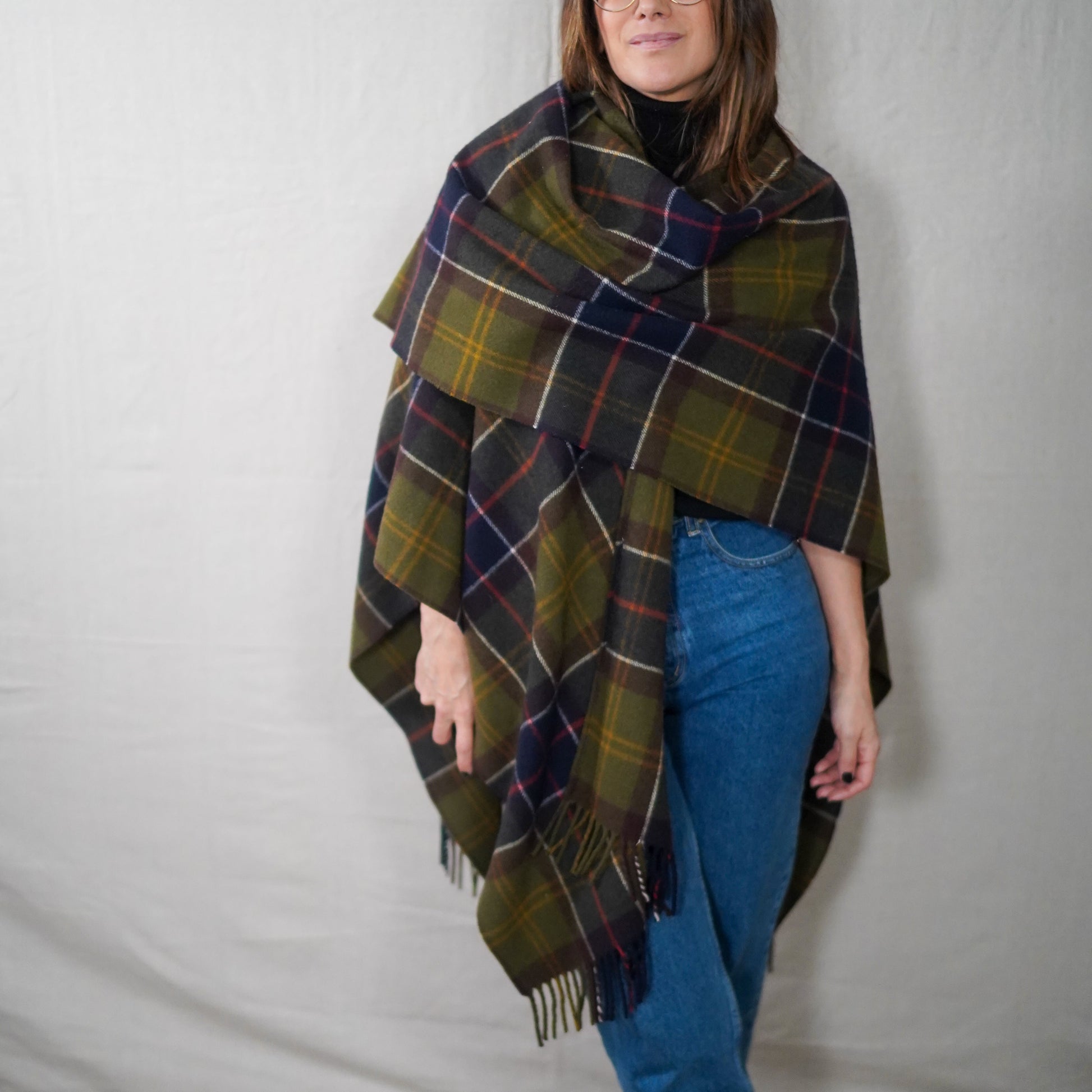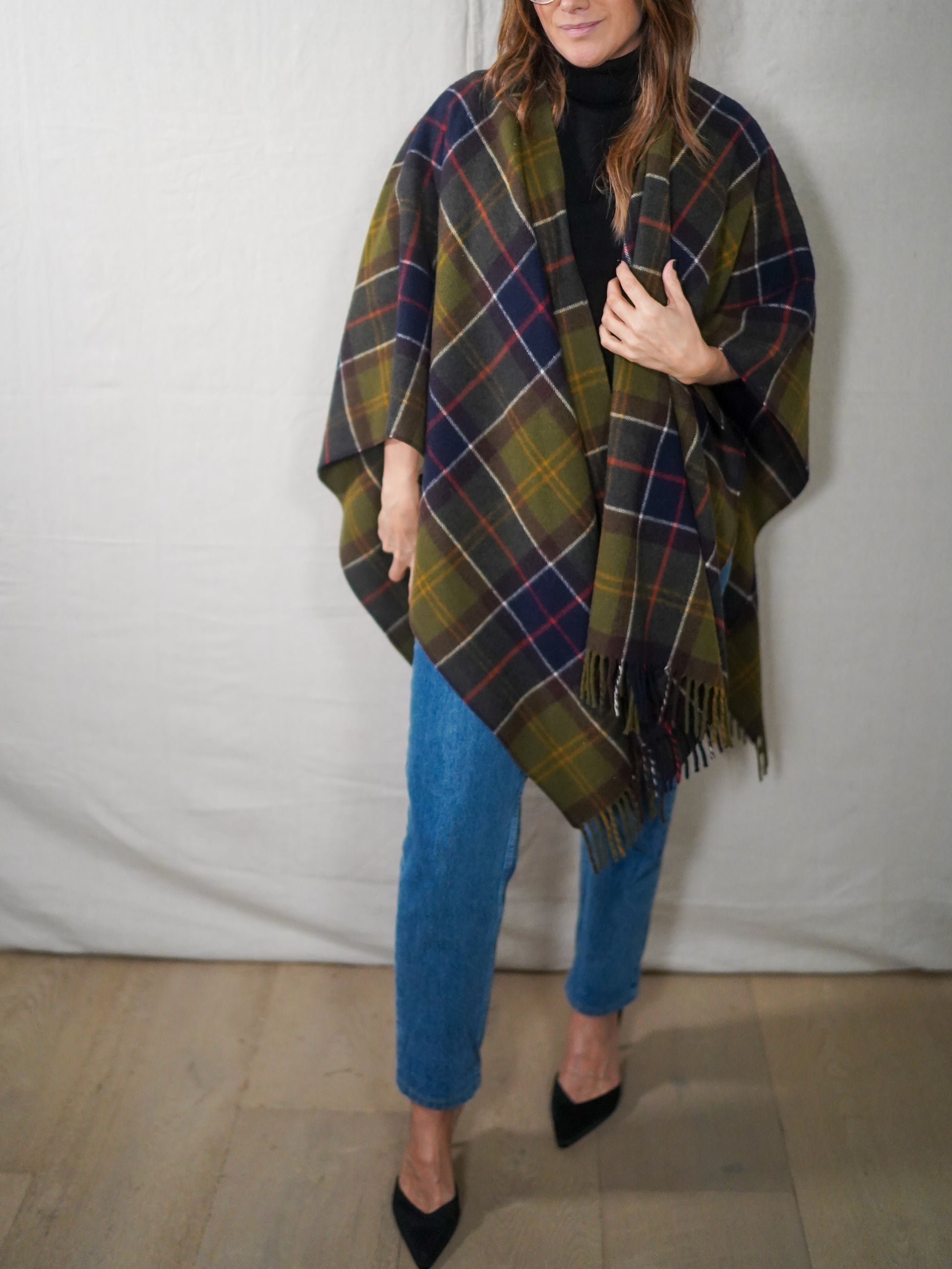 Quiet British countryside energy with real weight and drape. Classic Barbour tartan in deep olive, navy, and rust tones, cut as an easy throw-on cape that layers effortlessly over knits, denim, or tailoring. Fringe hem adds movement and texture. The kind of piece that instantly makes simple outfits feel intentional.