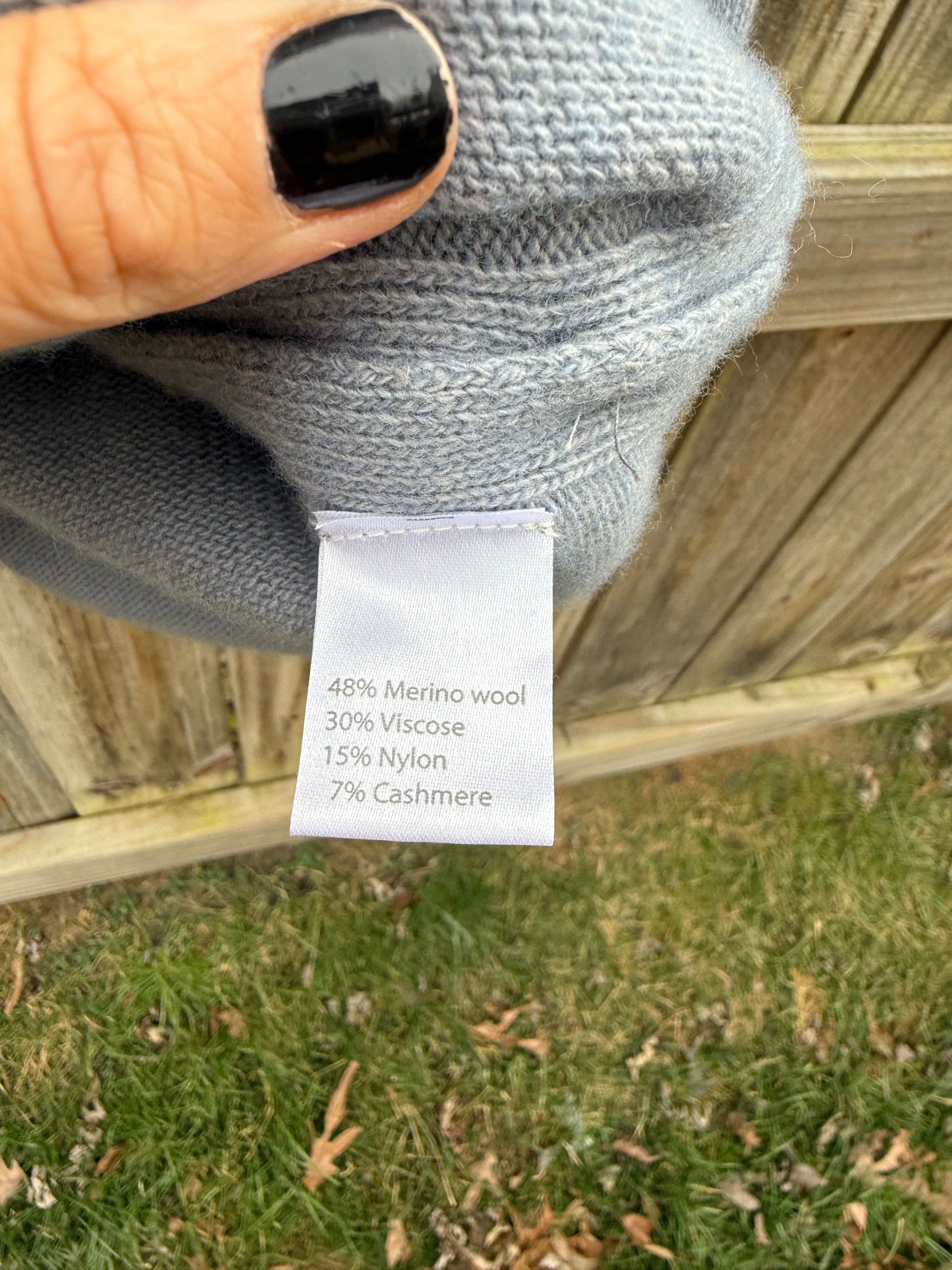 - Fabric: 48% merino wool, 30% viscose, 15% nylon, 7% cashmere