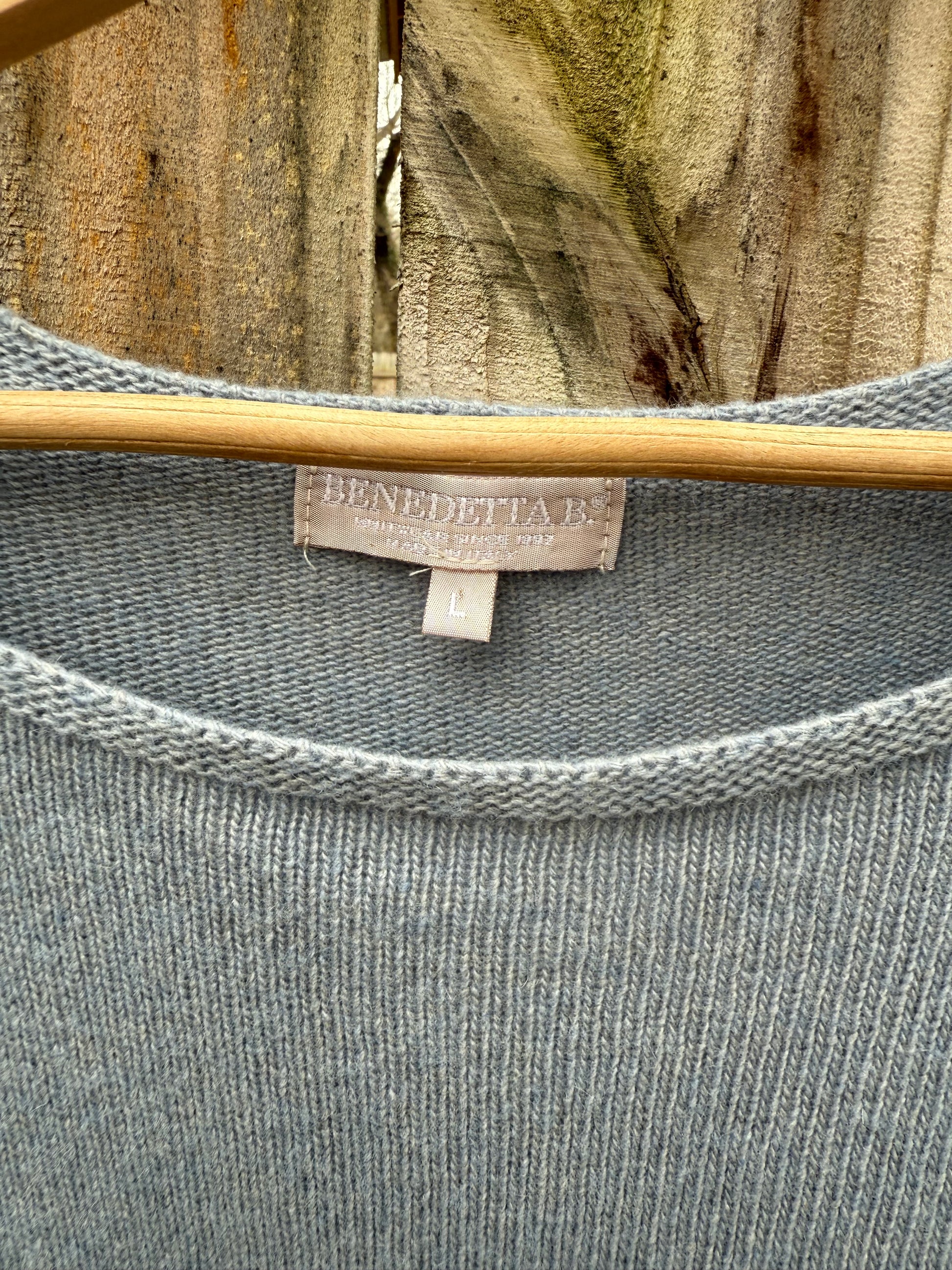 This is quiet European knitwear done properly. A soft blue Benetton sweater with a clean boat neckline and subtle side button detailing that reads very Italian ready-to-wear, not trend bait. The kind of piece that sits comfortably between late-90s United Colors minimalism and modern wardrobe building, the lane Phoebe-era Céline and current Totême customers live in.