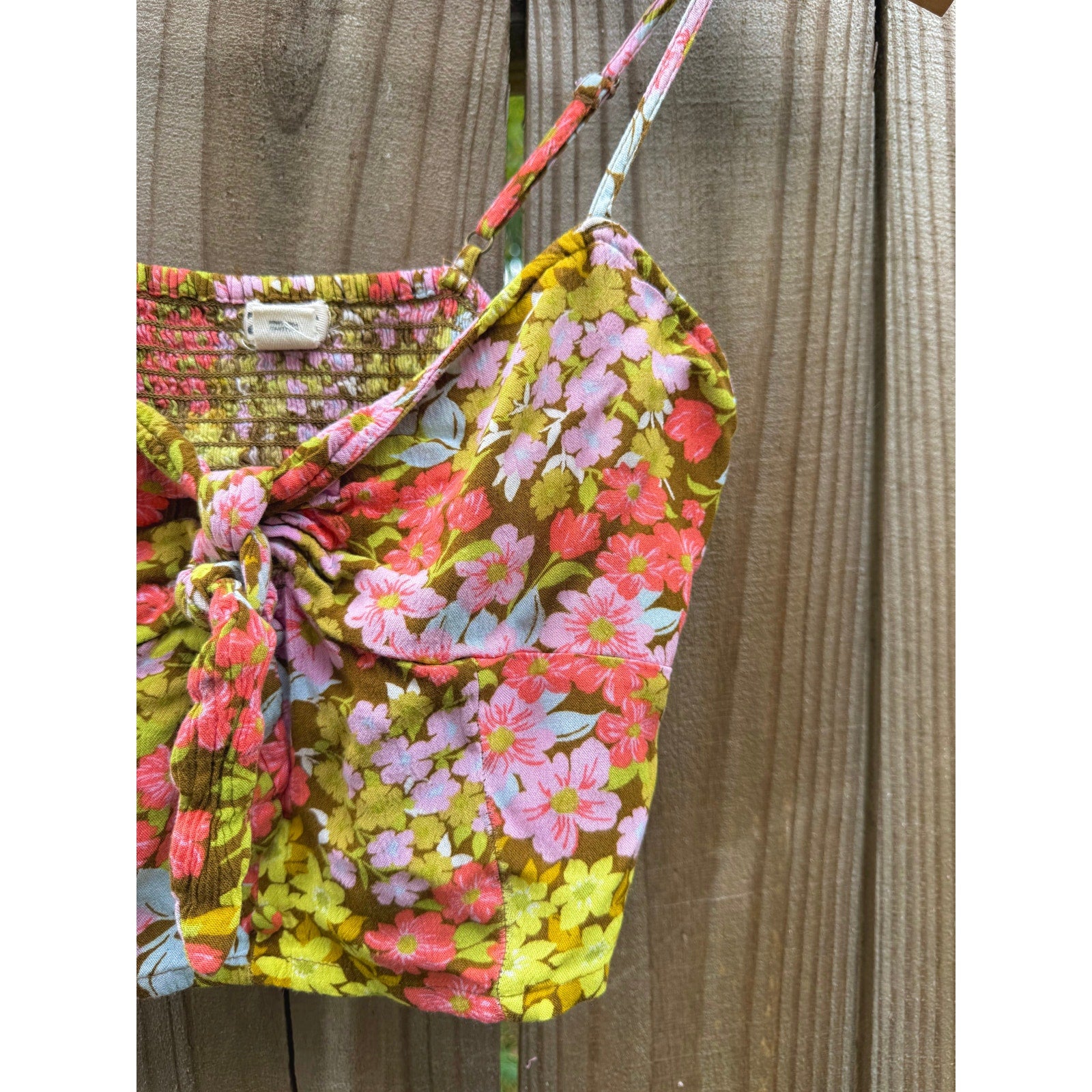 Bright and playful, this Billabong floral crop top brings vintage-inspired energy with its pink, green, and yellow floral print. Features adjustable spaghetti straps, a tie front detail, and smocked back for stretch and comfort. Cropped fit that pairs effortlessly with high-waisted shorts, skirts, or denim.
