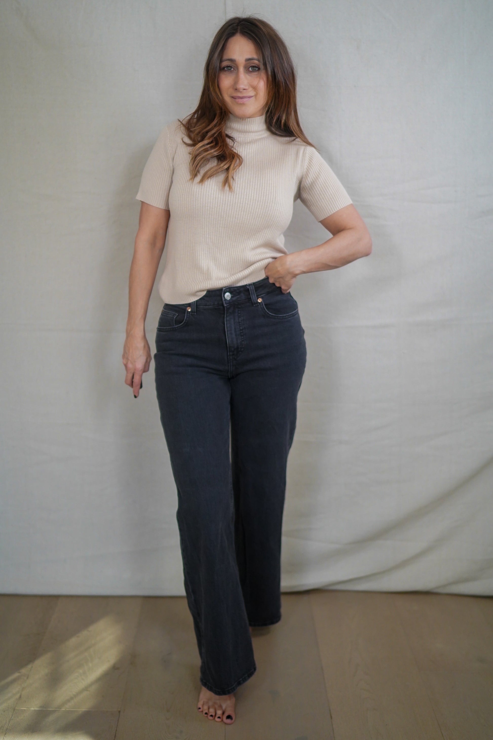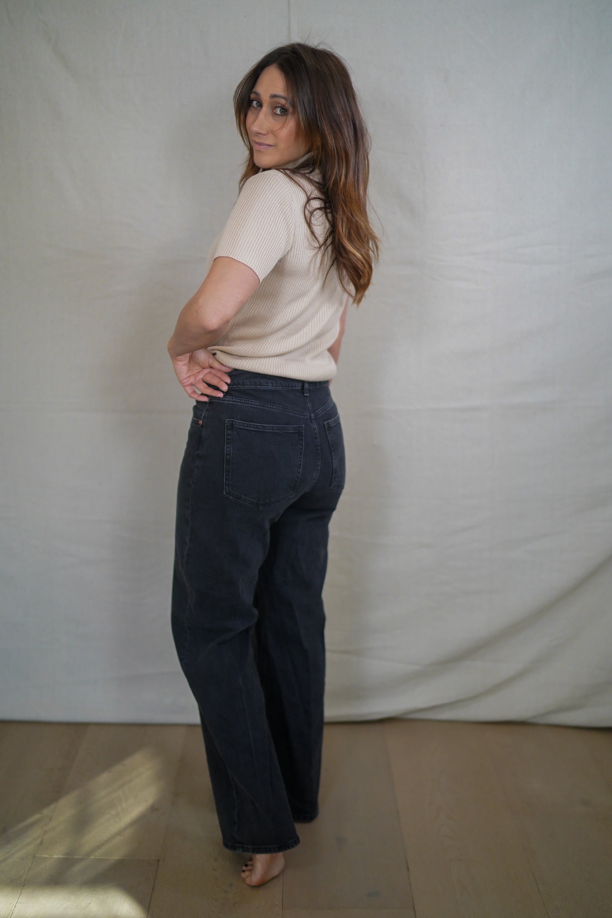A true high-rise black jean with a clean straight leg and a soft charcoal wash. Structured through the hip, relaxed from the thigh down, with a raw hem that lands neatly at the ankle on most.