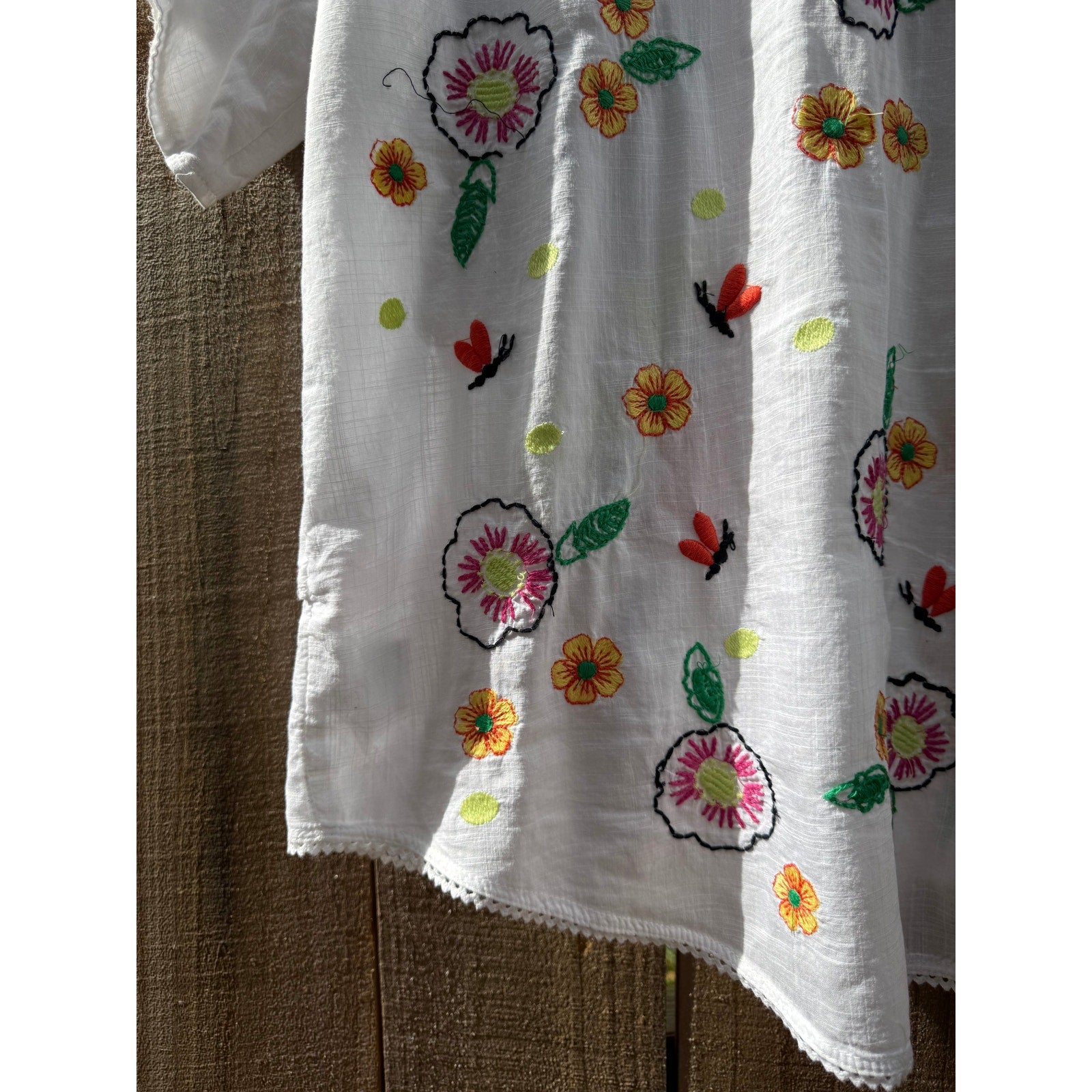 Curated Pre-Loved – An artful, one-of-a-kind embroidered button-up camp shirt with vibrant patchwork florals and hand-done detailing. Perfect for layering or tying at the waist.