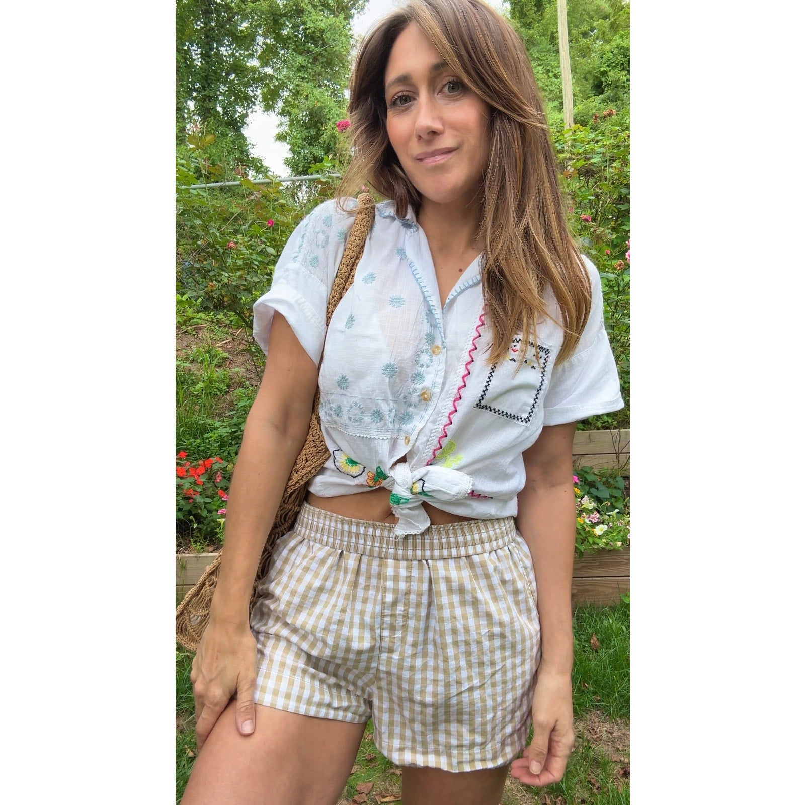 Relaxed fit, short sleeves, lightweight cotton. Best for S–M depending on desired silhouette. Styled here tied at the waist (model 5’5”, modern size 4/6).