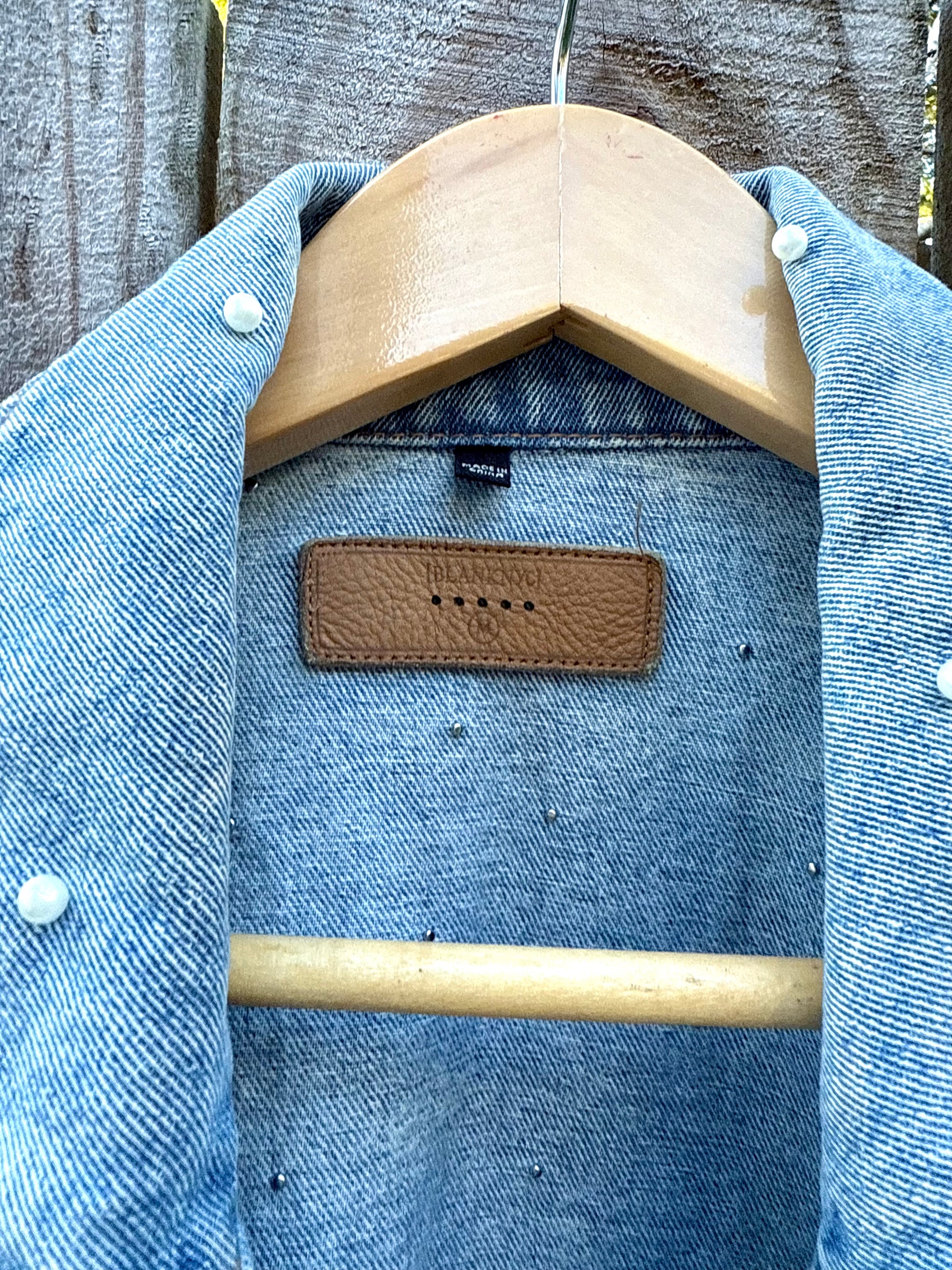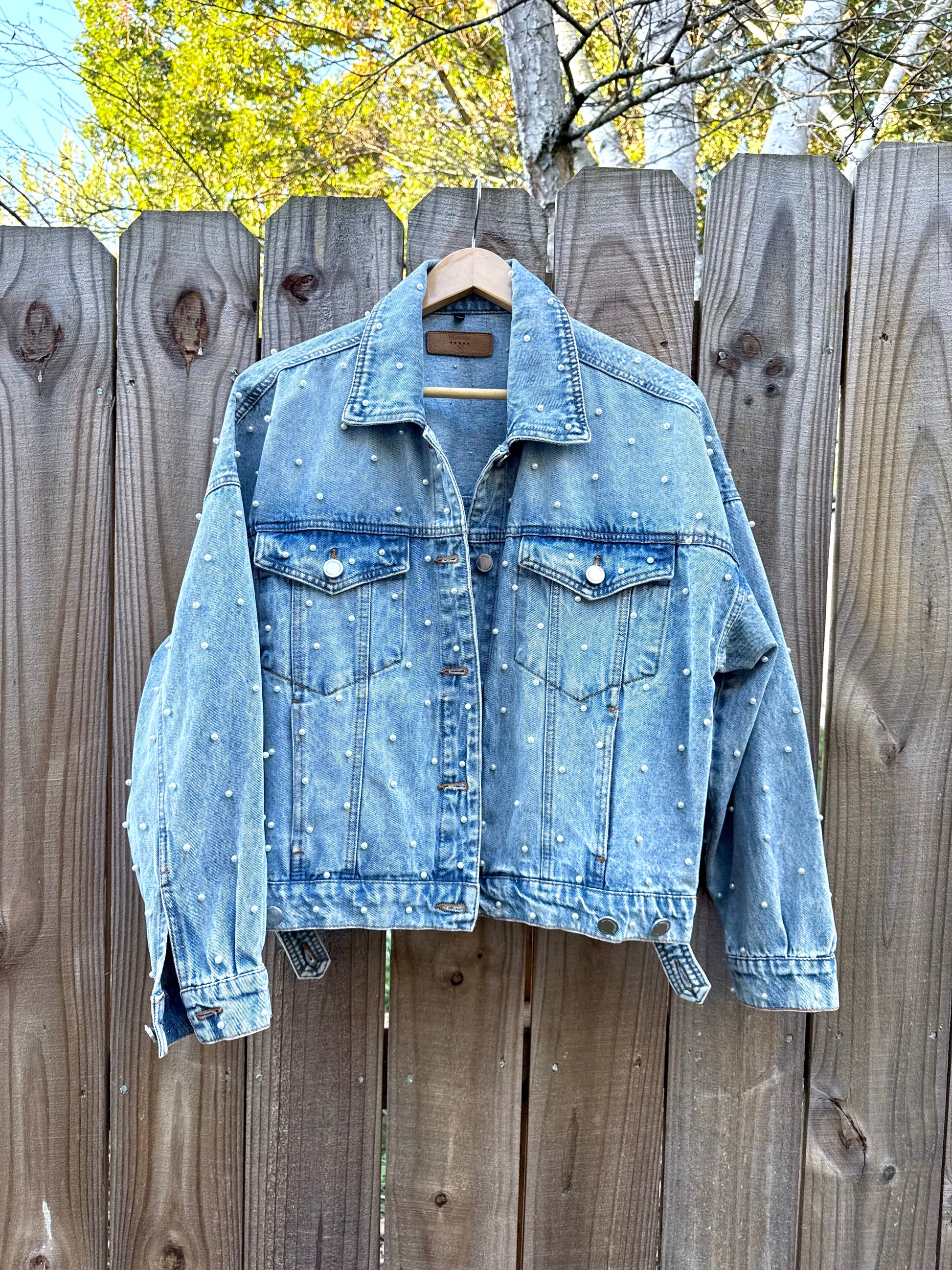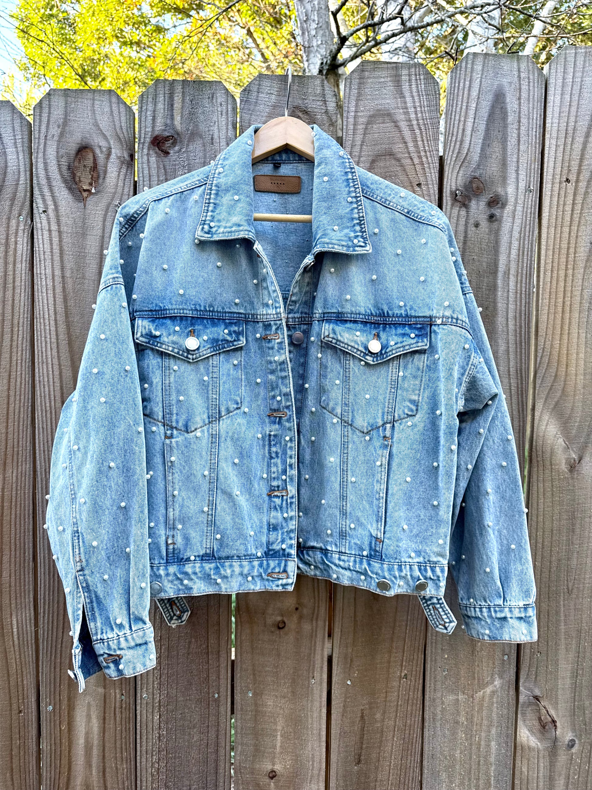 Softly washed denim jacket covered in pearl studding — flirty, grunge-meets-girly energy that nails the 2000s festival comeback. Layer over crochet, slip minis, or low-rise cargos for Coachella ’04 done right.