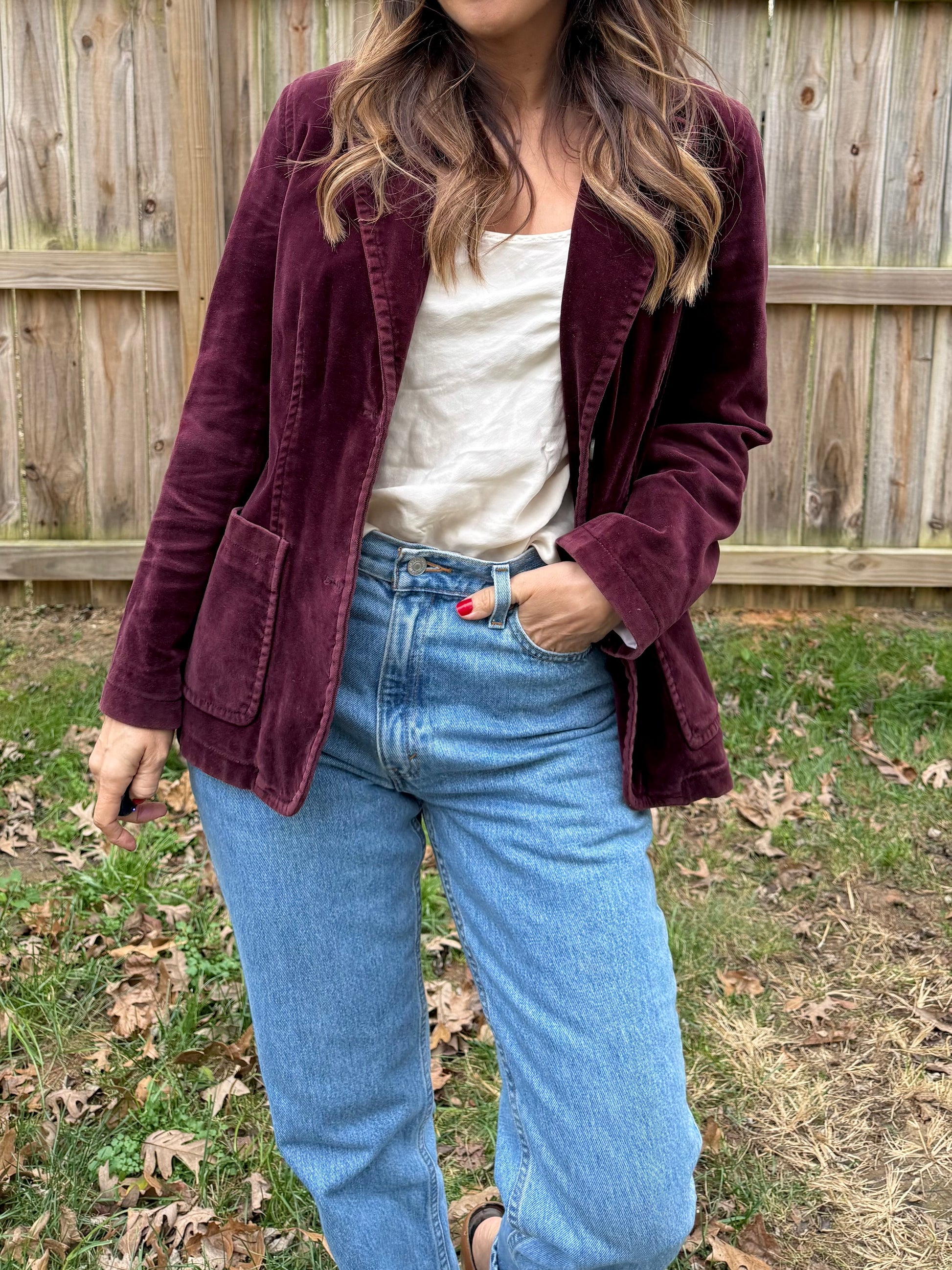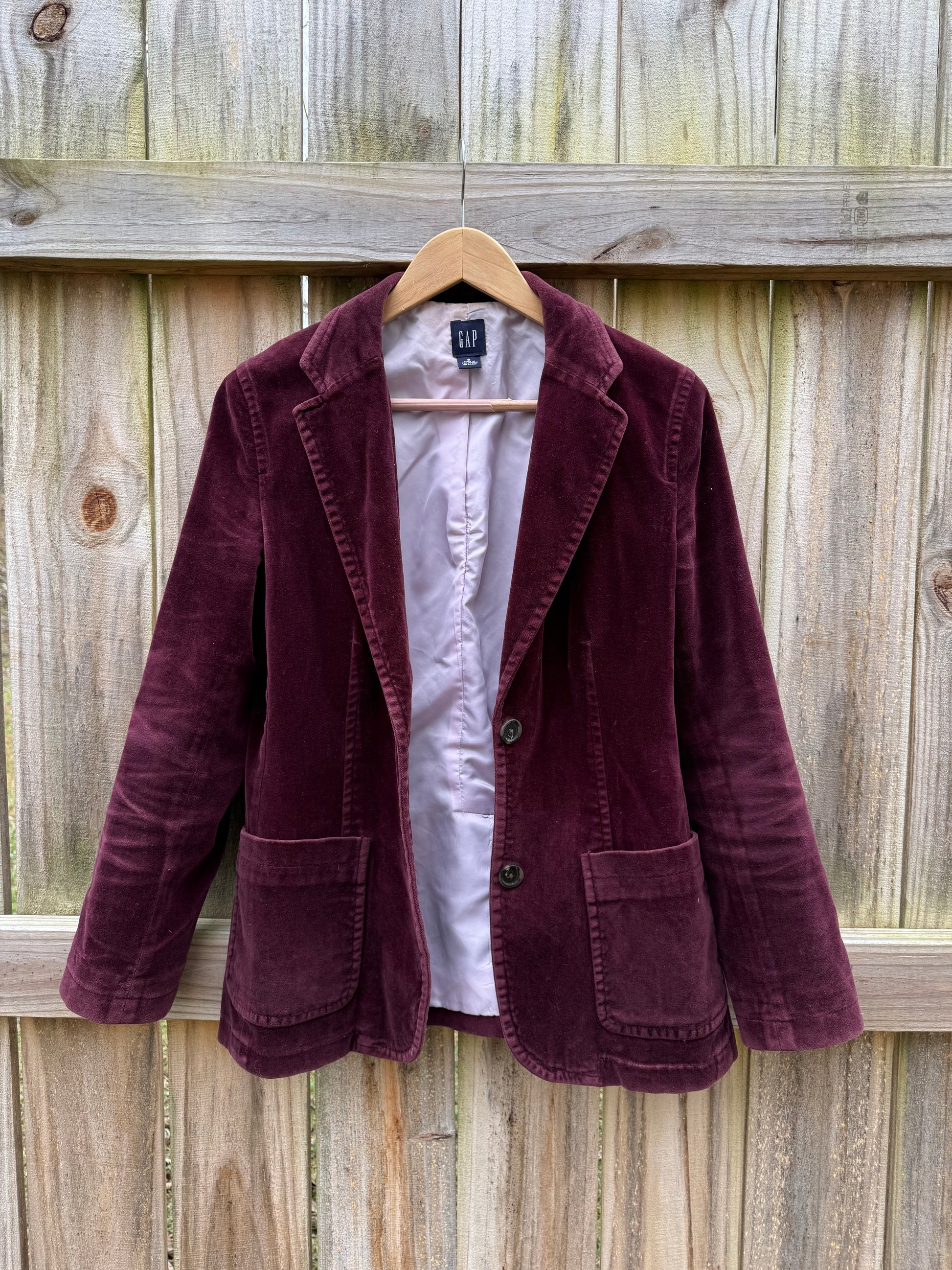 (burgundy velvet blazer, cotton velvet jacket, lodge blazer, GAP, J.Crew, Alex Mill)
