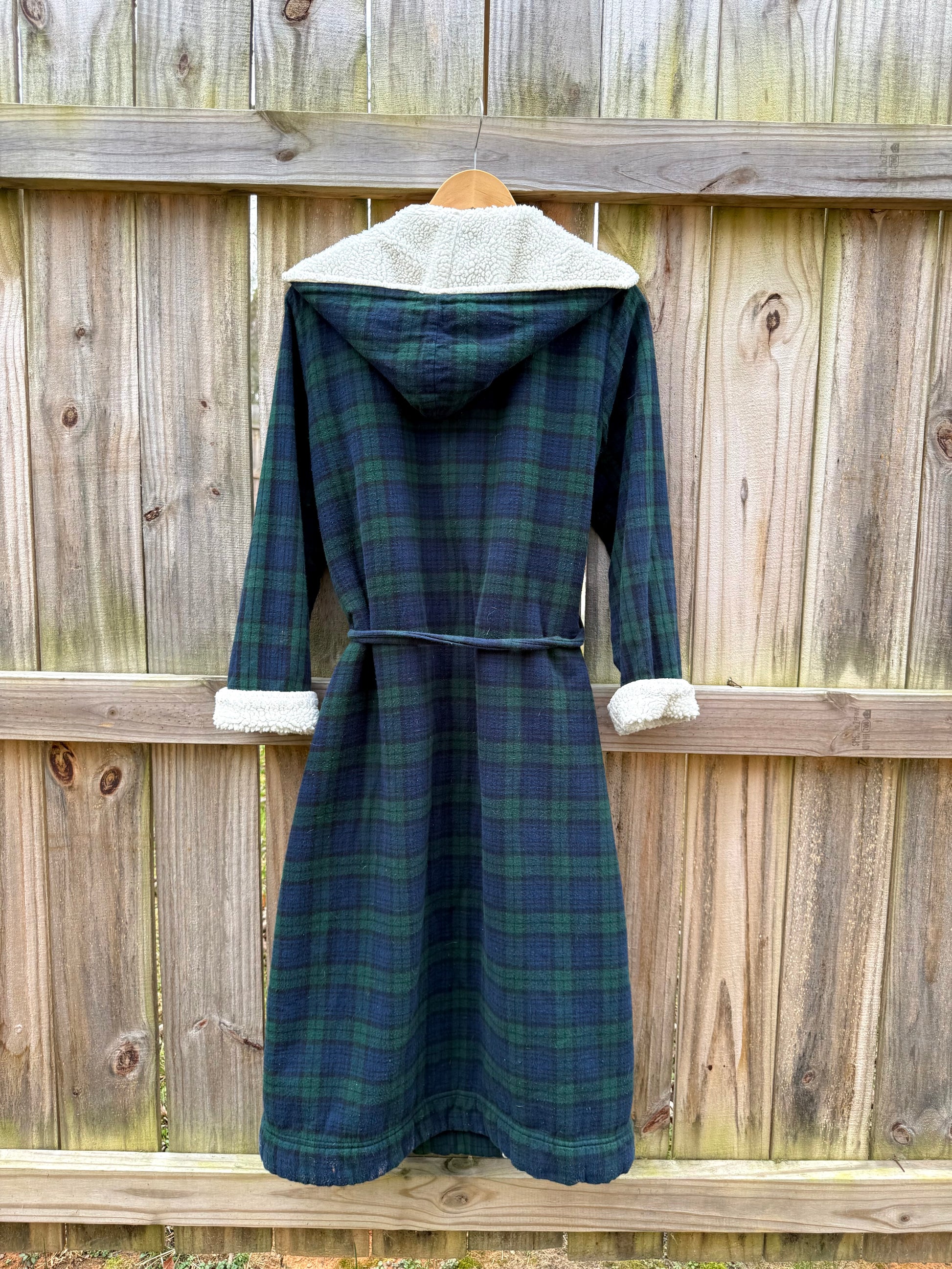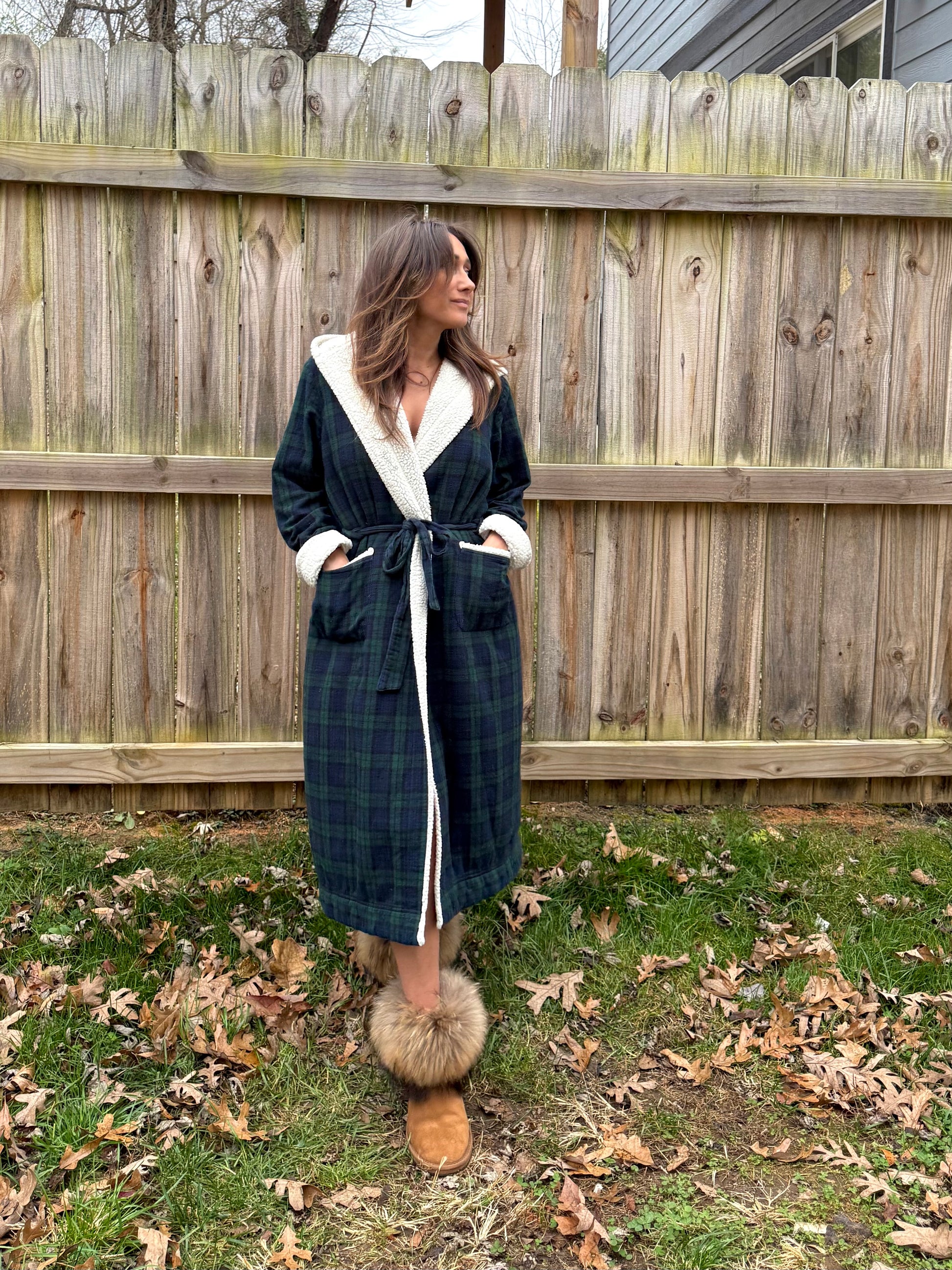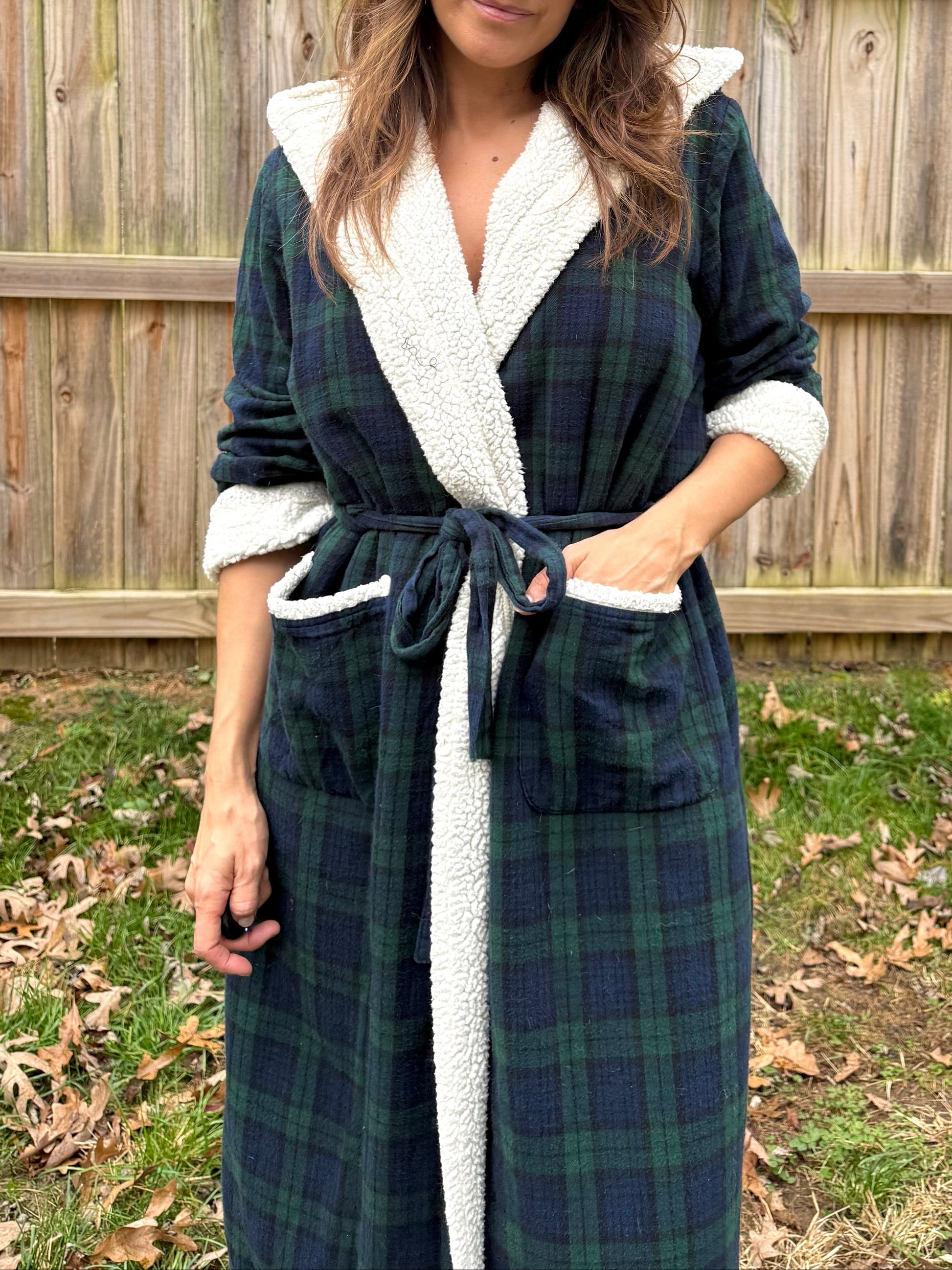 The robe that nails that winter-off-duty look — green/navy tartan outside, full sherpa inside, hooded, belted, and actually flattering. Think the kind of piece you throw on and suddenly look like the person who cooks eggs in a cast iron skillet and wakes up in a chalet overlooking the slopes. Clean, classic, and surprisingly stylish for something you wear at home.