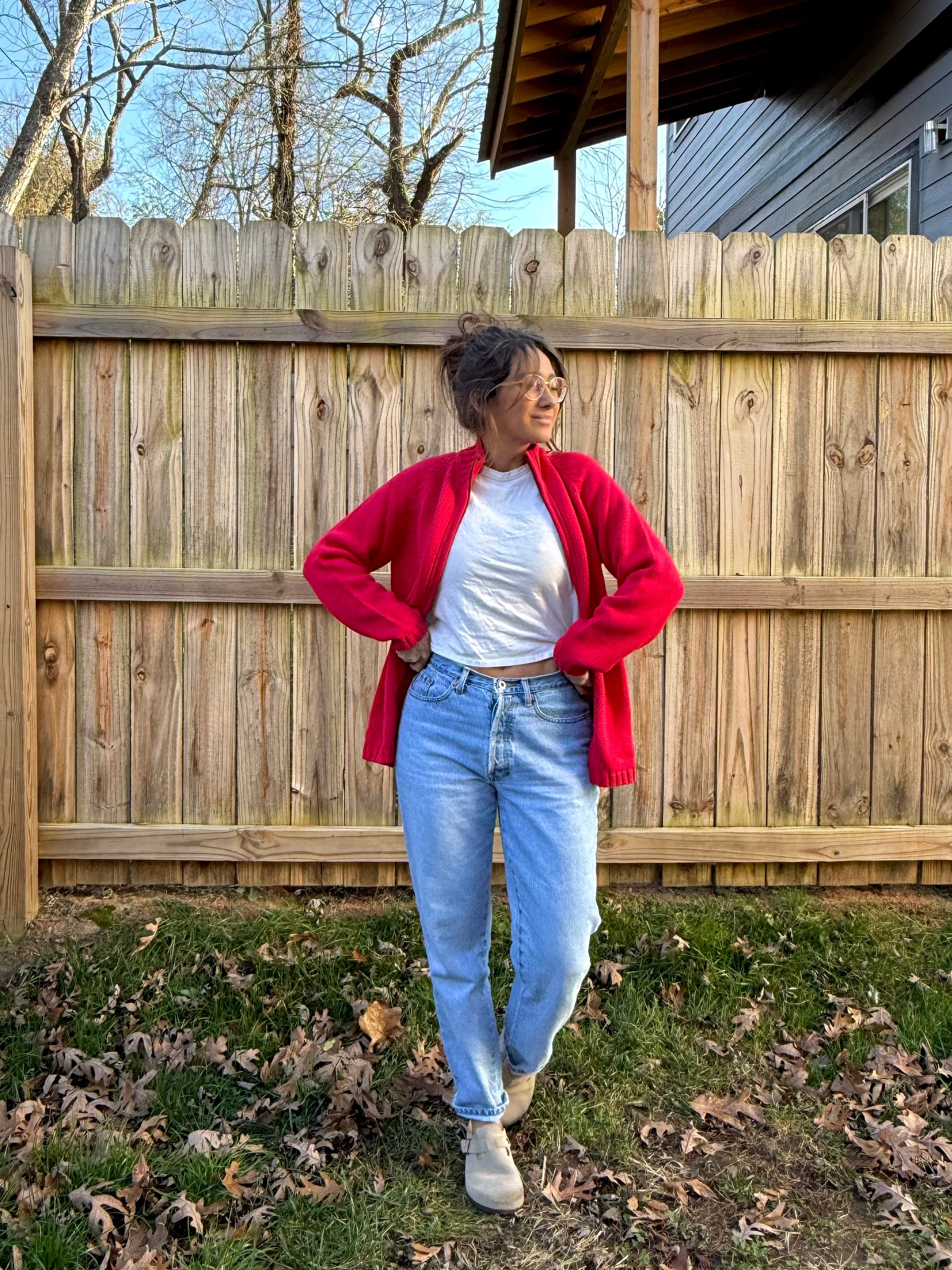 Styling notes: It’s the red knit you see all over the Pinterest mood boards — throw it on with straight denim and New Balance for an easy everyday look, or slide on your Birks with chunky socks for a casual winter vibe. It also layers perfectly under a worn-in barn jacket, adding that pop of red that makes the whole outfit feel more intentional without trying.