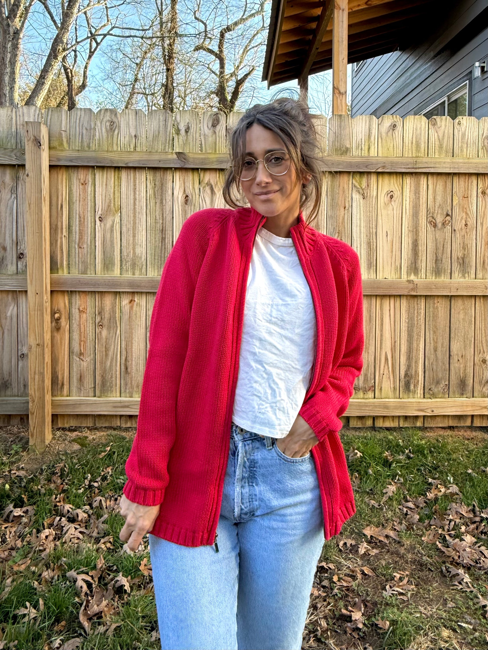 (red zip sweater, cotton rib knit, winter zip jacket, L.L. Bean style, L.L. Bean, Eddie Bauer, J.Crew)