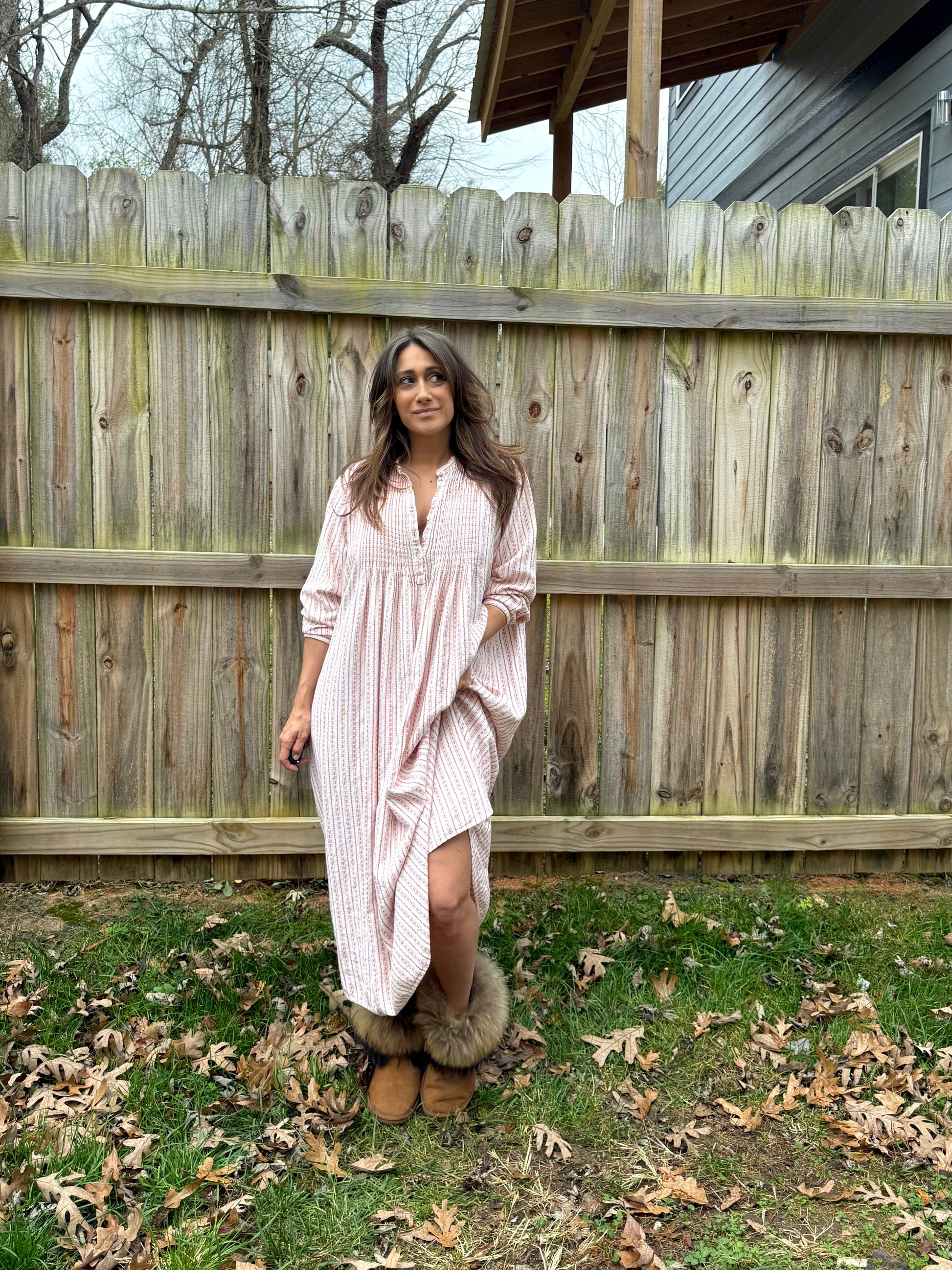 A classic L.L. Bean cotton nightgown in a nostalgic red stripe with pintuck detailing and shell buttons. It has that cozy, heritage cabin-core vibe that’s genuinely good — the kind of winter sleepwear that feels timeless, practical, and still somehow stylish. The cut is relaxed, the cotton is soft, and the whole thing just reads “classic Bean” in the best way.