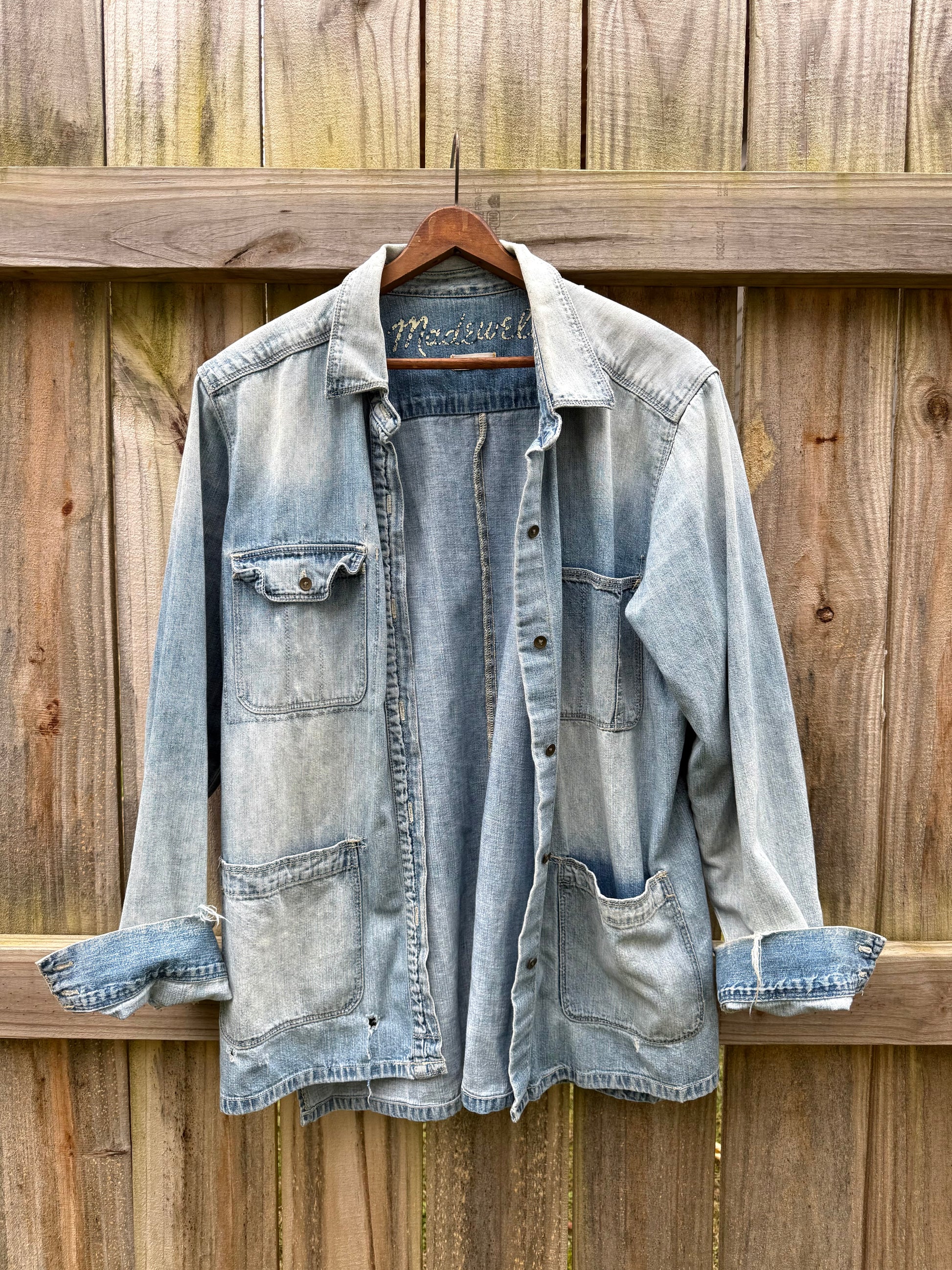 (light wash denim jacket, oversized denim shirt, chore coat, vintage workwear style, Levi’s, Alex Mill, Gap)