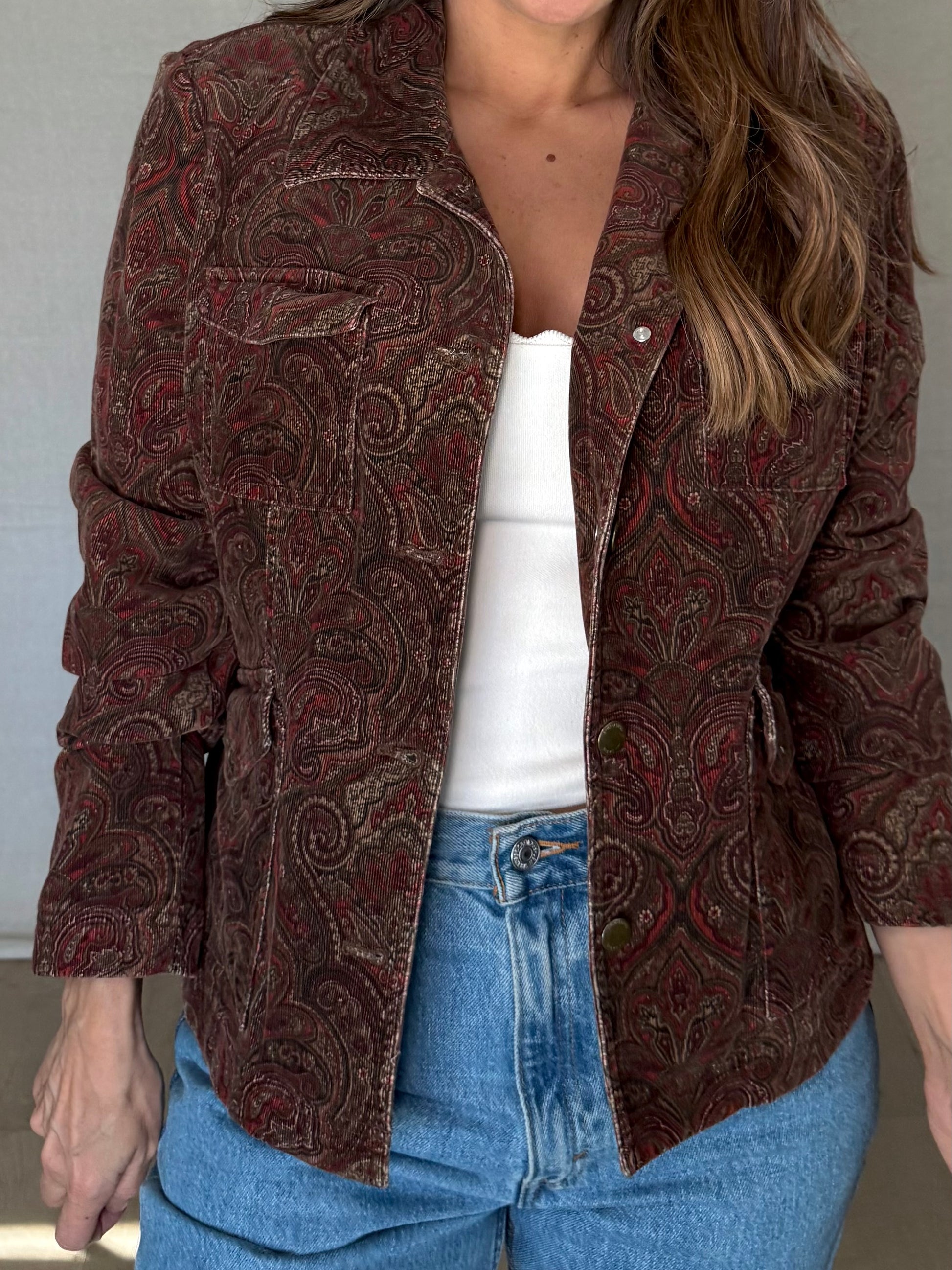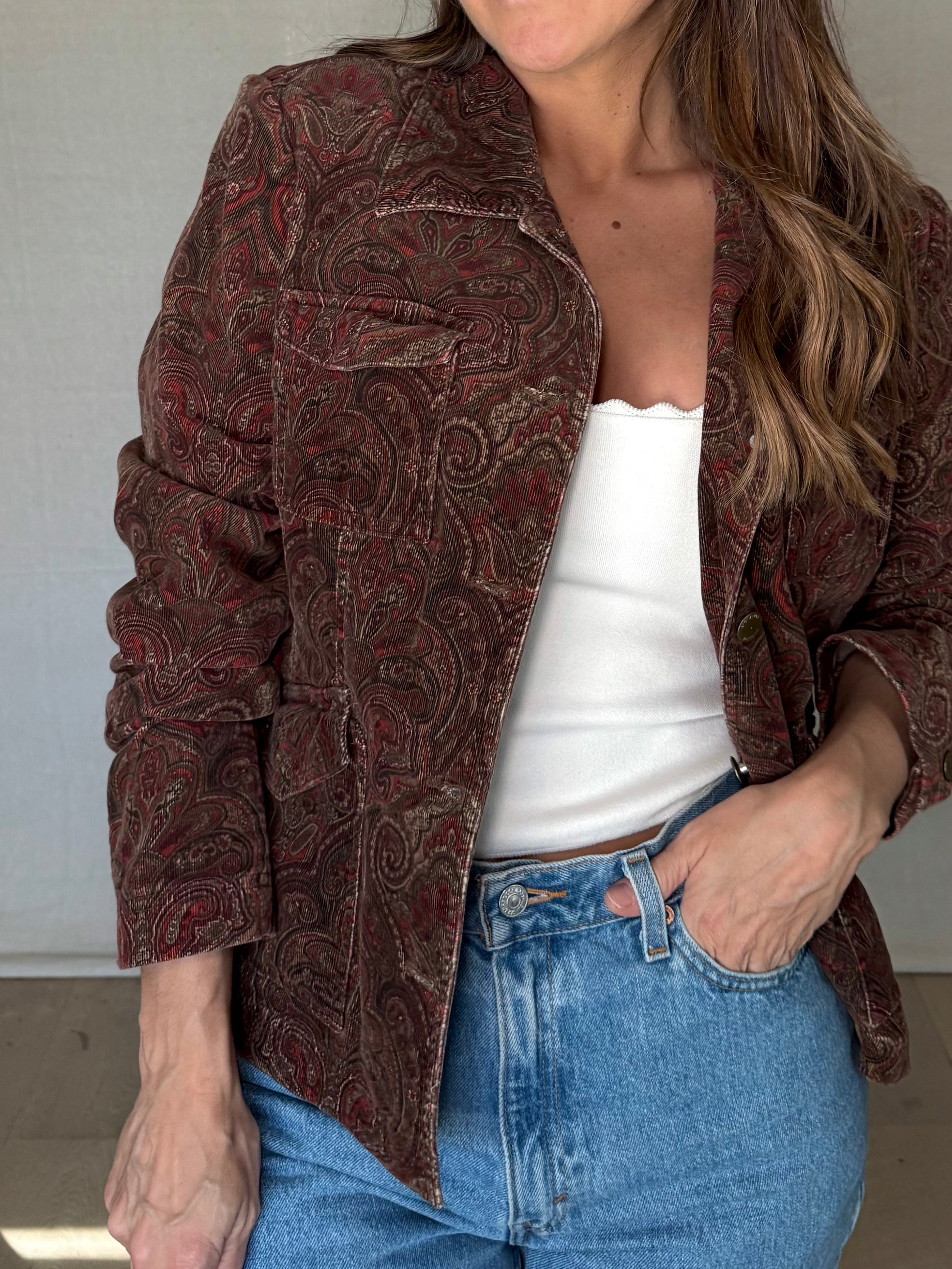 The print is intricate without being loud, and the corduroy has that worn-in depth that only comes from real wear, not reproduction washes. Slightly cropped with structure through the shoulders, it layers easily over tanks, knits, or a simple tee without turning precious.