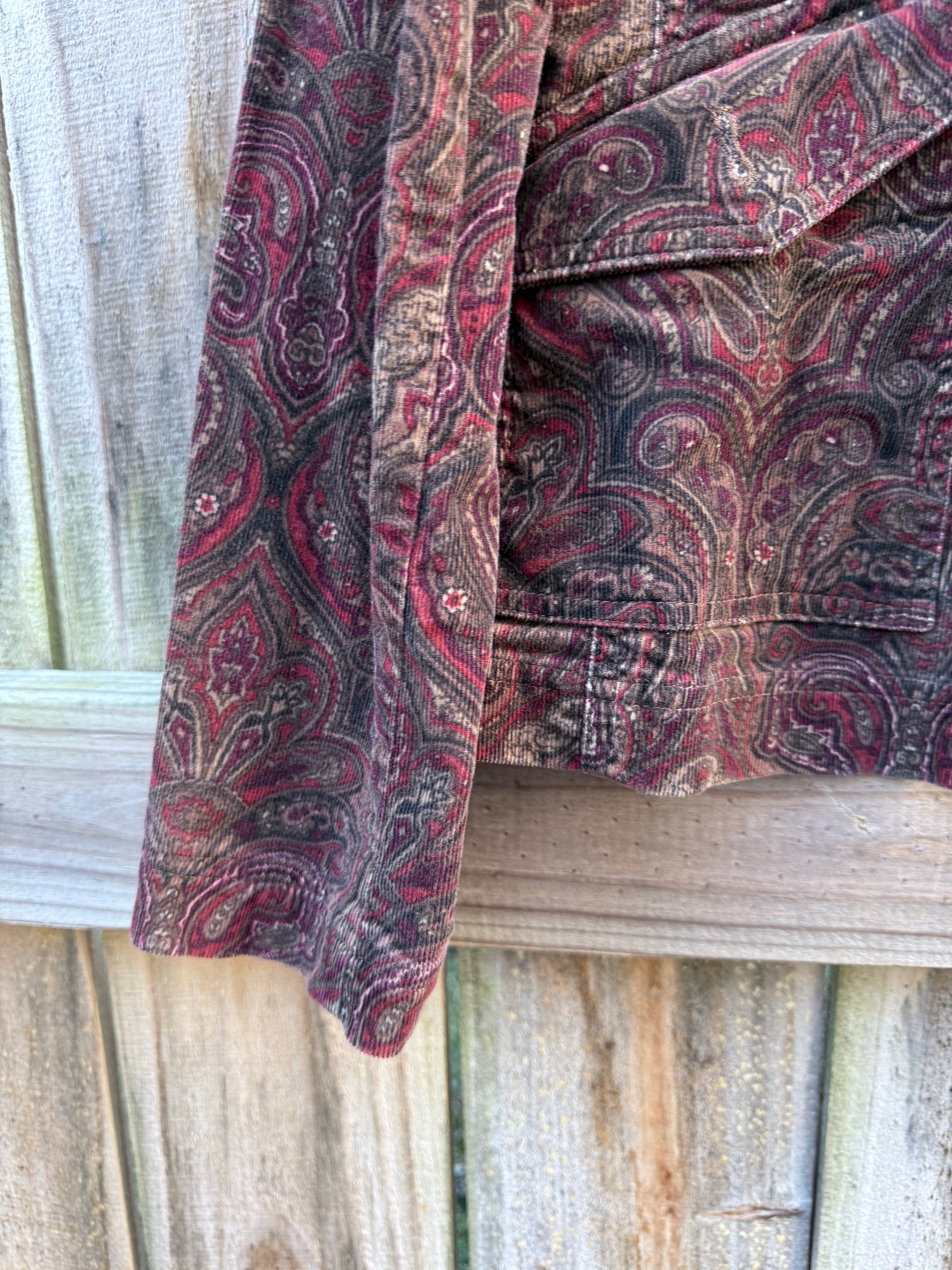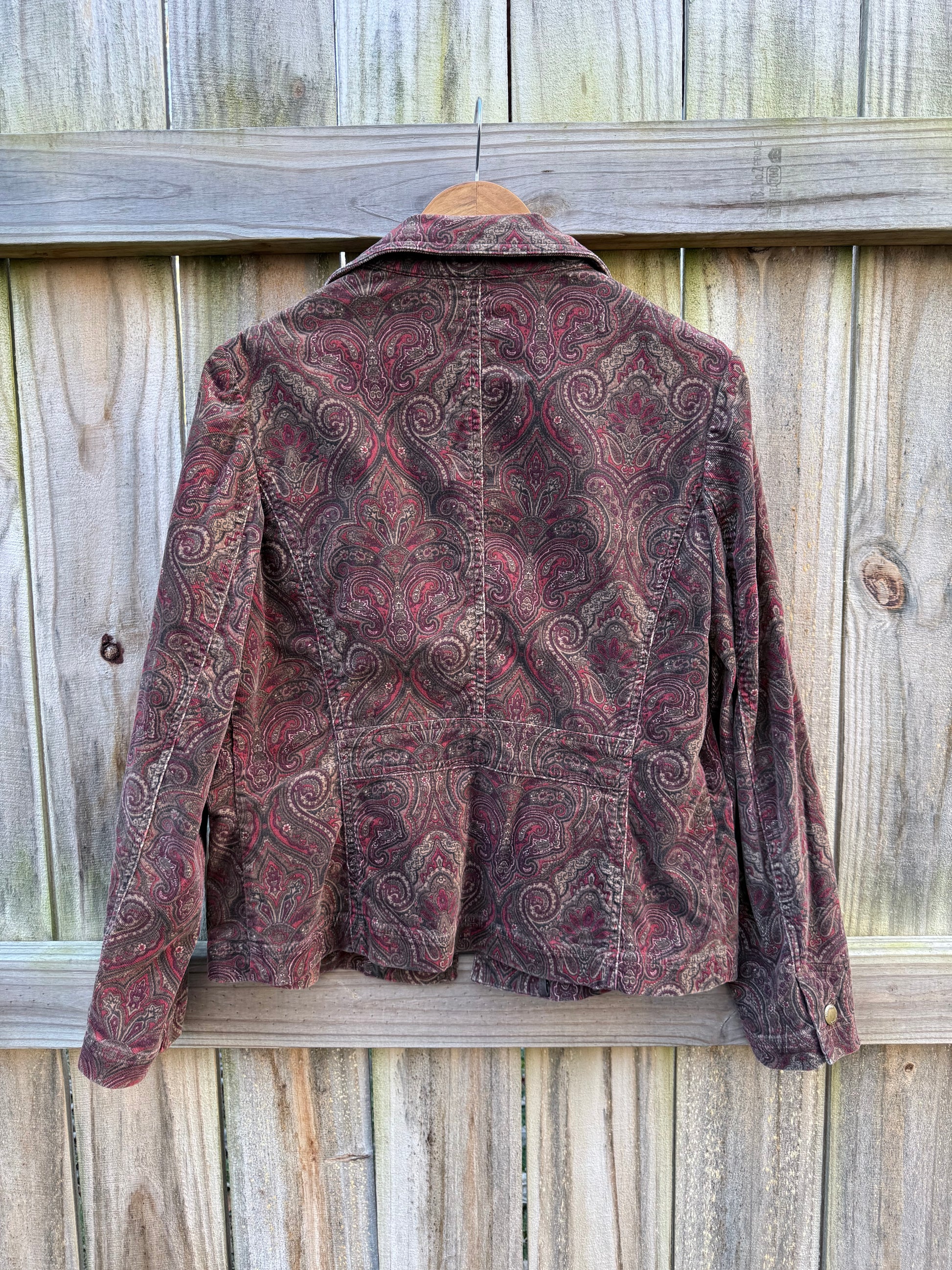 This is the kind of jacket that quietly does the work. Rich, washed paisley corduroy in deep wine and brown tones, cut like a classic field jacket but softened by time and texture. It feels collected, not styled — like something you pulled from a really good closet and never gave back.