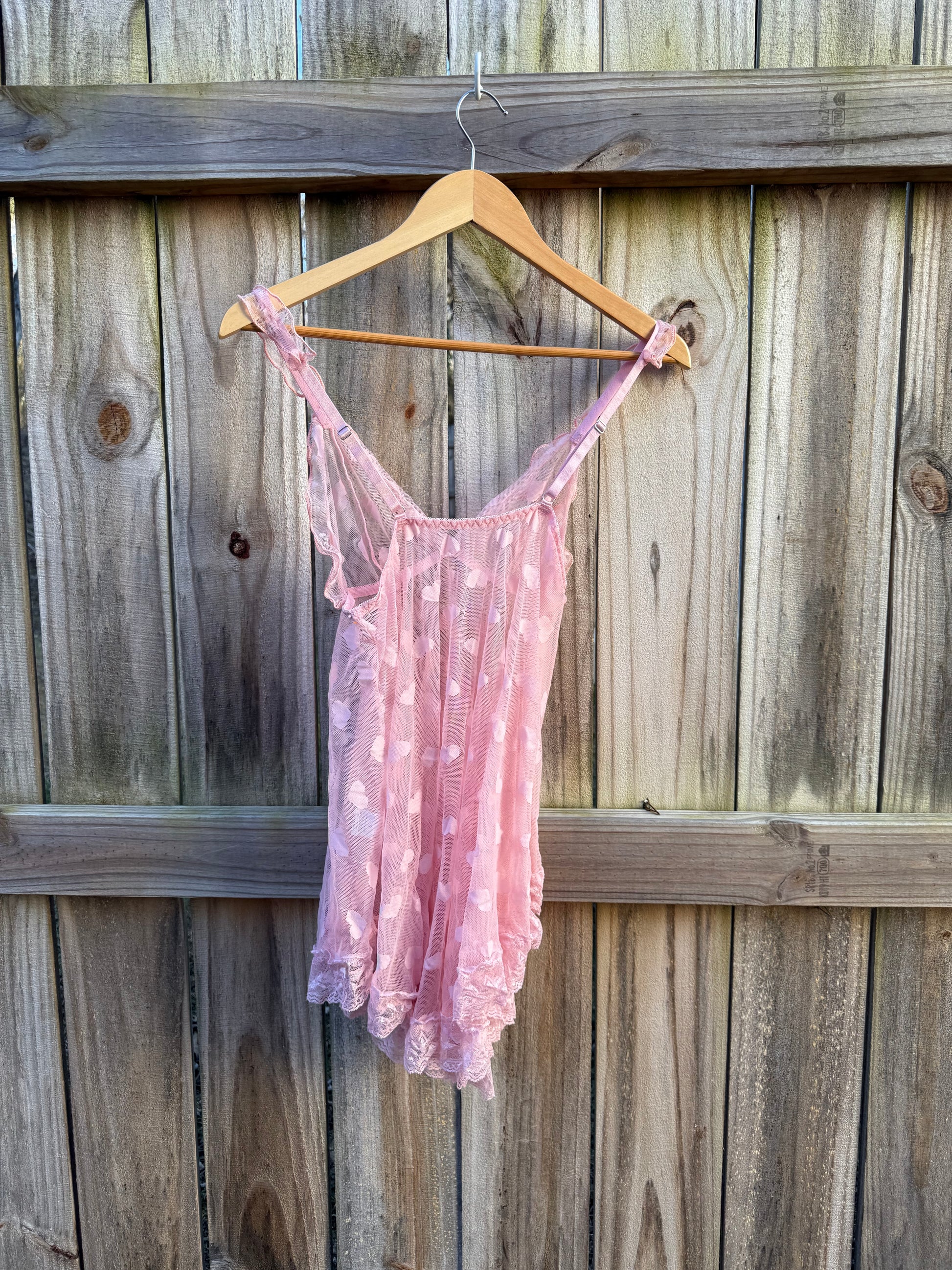 (pink heart slip, y2k lingerie dress, sheer mesh mini, valentines aesthetic, babydoll slip)