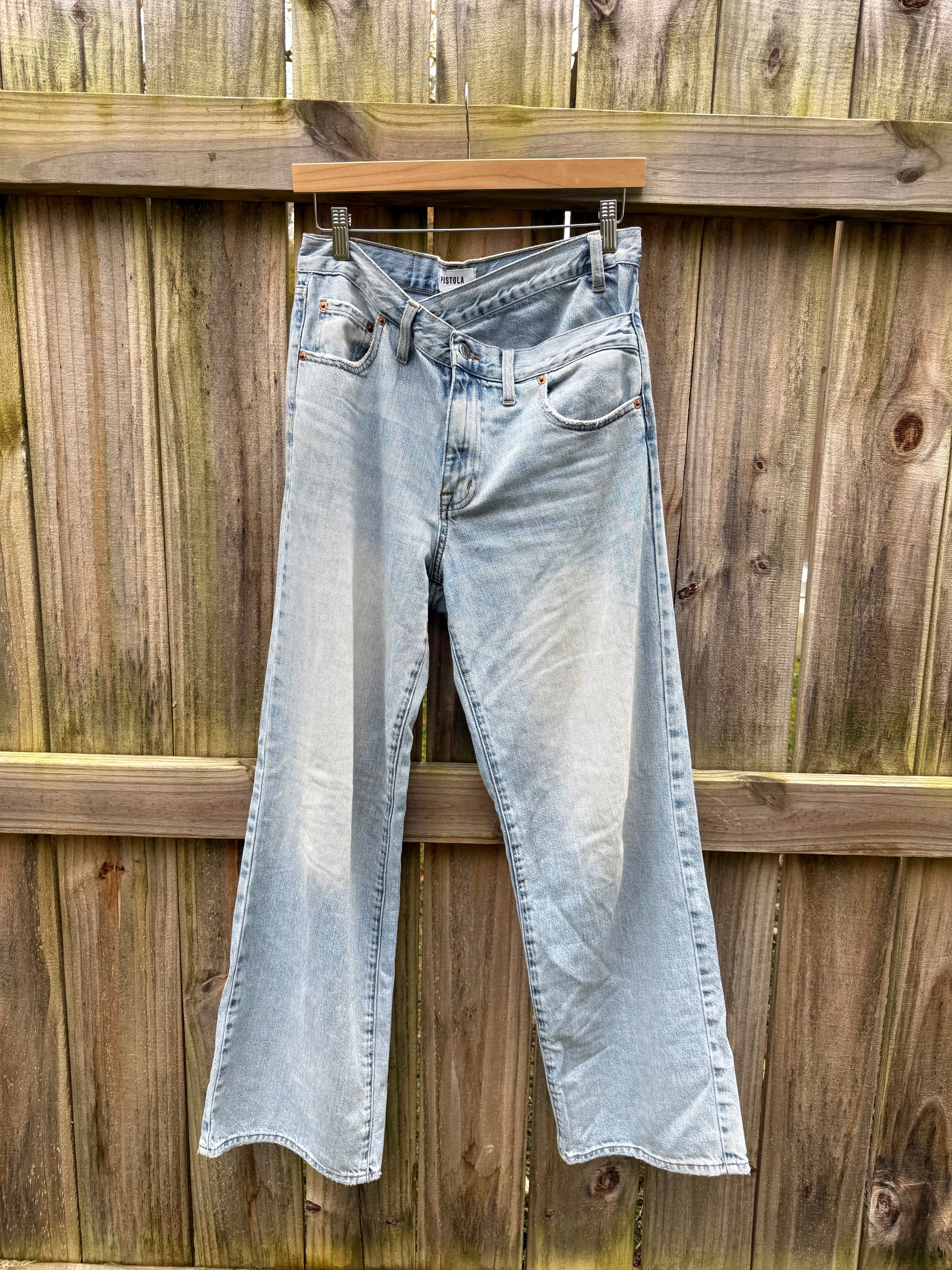 Light wash denim with the signature asymmetrical crossover waist. Low-mid rise with that early-2000s broken-in feel and straight leg shape that drapes just right. Feels designer without trying.
