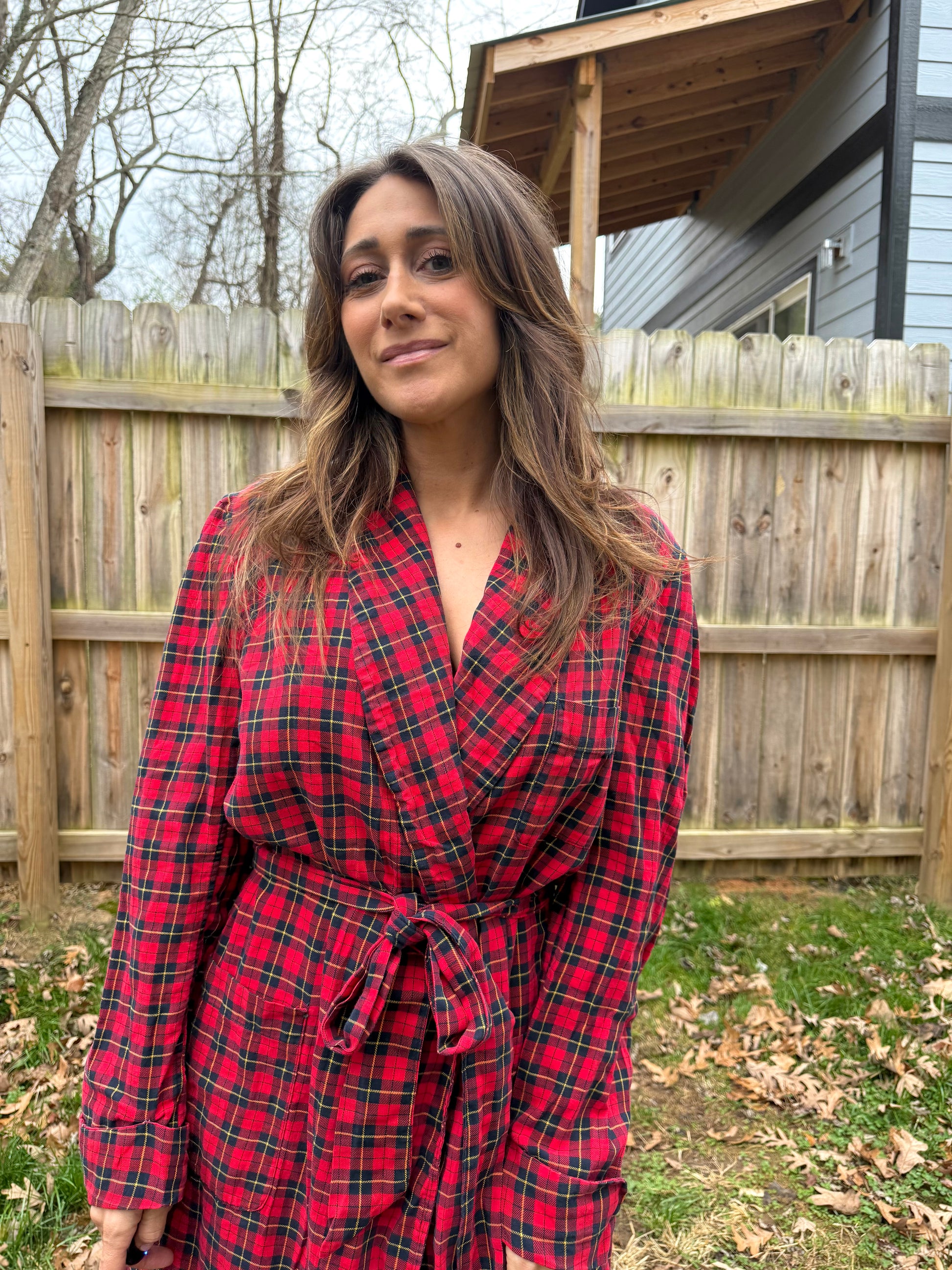 (flannel robe, plaid robe, heritage loungewear, cabin robe, LL Bean vibe, Vermont Country Store)