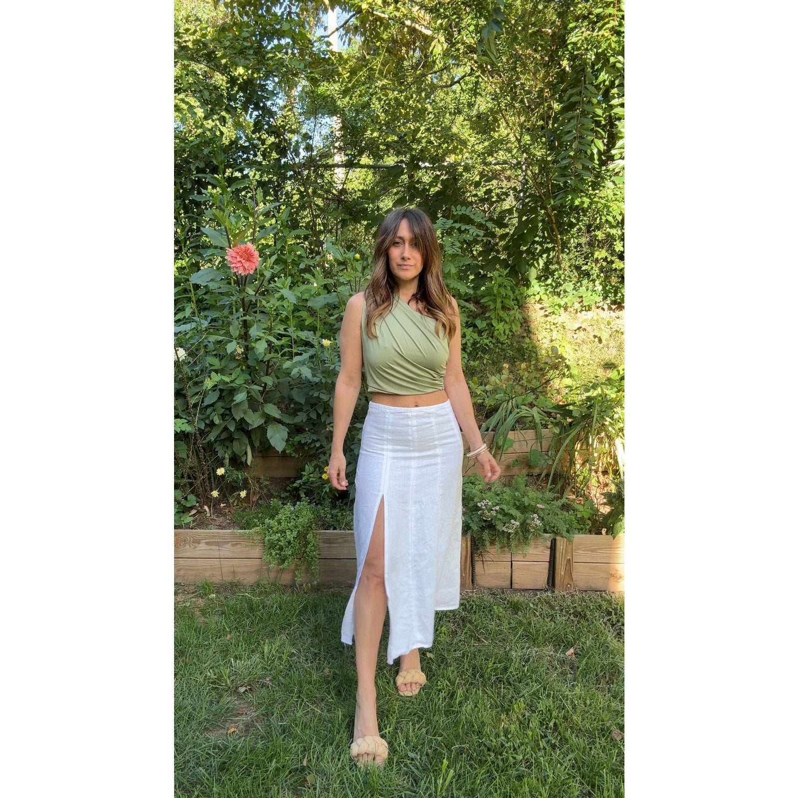 Minimalist bones, reimagined. This skirt started oversized and lined, but was reworked by Sunday Honey into a clean, modern silhouette — waist tailored, lining removed, and a front slit added for movement. It’s the kind of effortless linen piece you’d expect to see at Reformation or Toteme, but one-of-a-kind in construction.