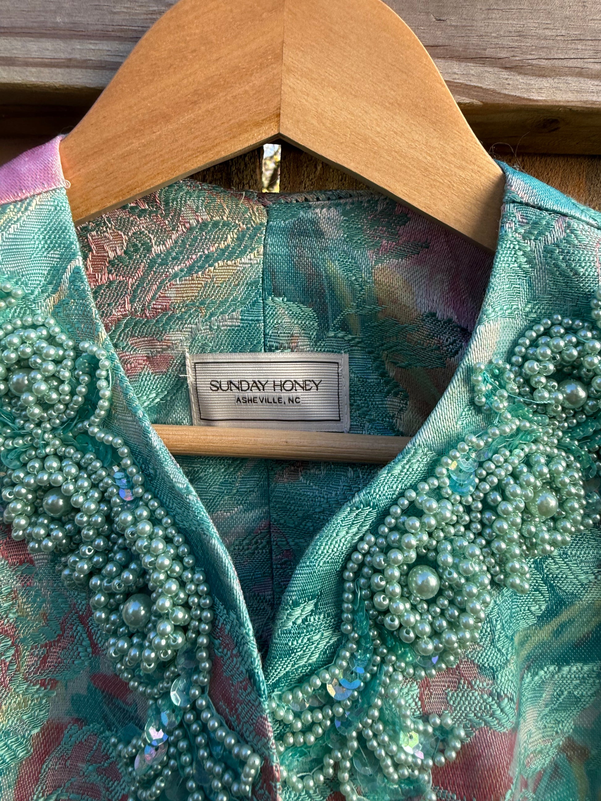 Reworked from an 80s beaded blazer into a modern, sculptural cropped jacket with flattering princess seams and curved hem. Aqua, blush, and sage floral brocade with hand-beaded detailing at the collar. Best fit is S/M, depending on desired drape. Works effortlessly with denim and a tank for an elevated everyday look, or styled with silk or tailoring for a true editorial entrance. Feminine, artistic, and bold without tipping into costume — a true one-of-one Sunday Honey original.