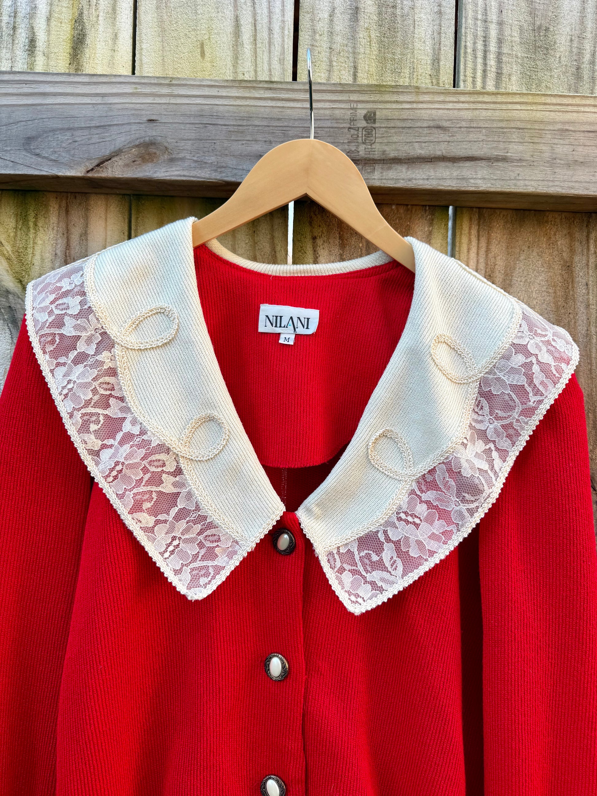 Reworked Vintage Red Cardigan with Lace Collar - Grandmillenial - Holiday