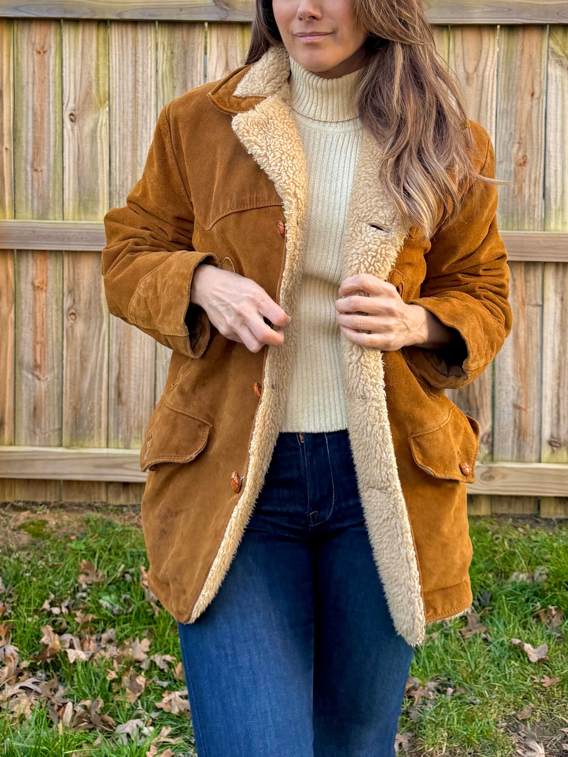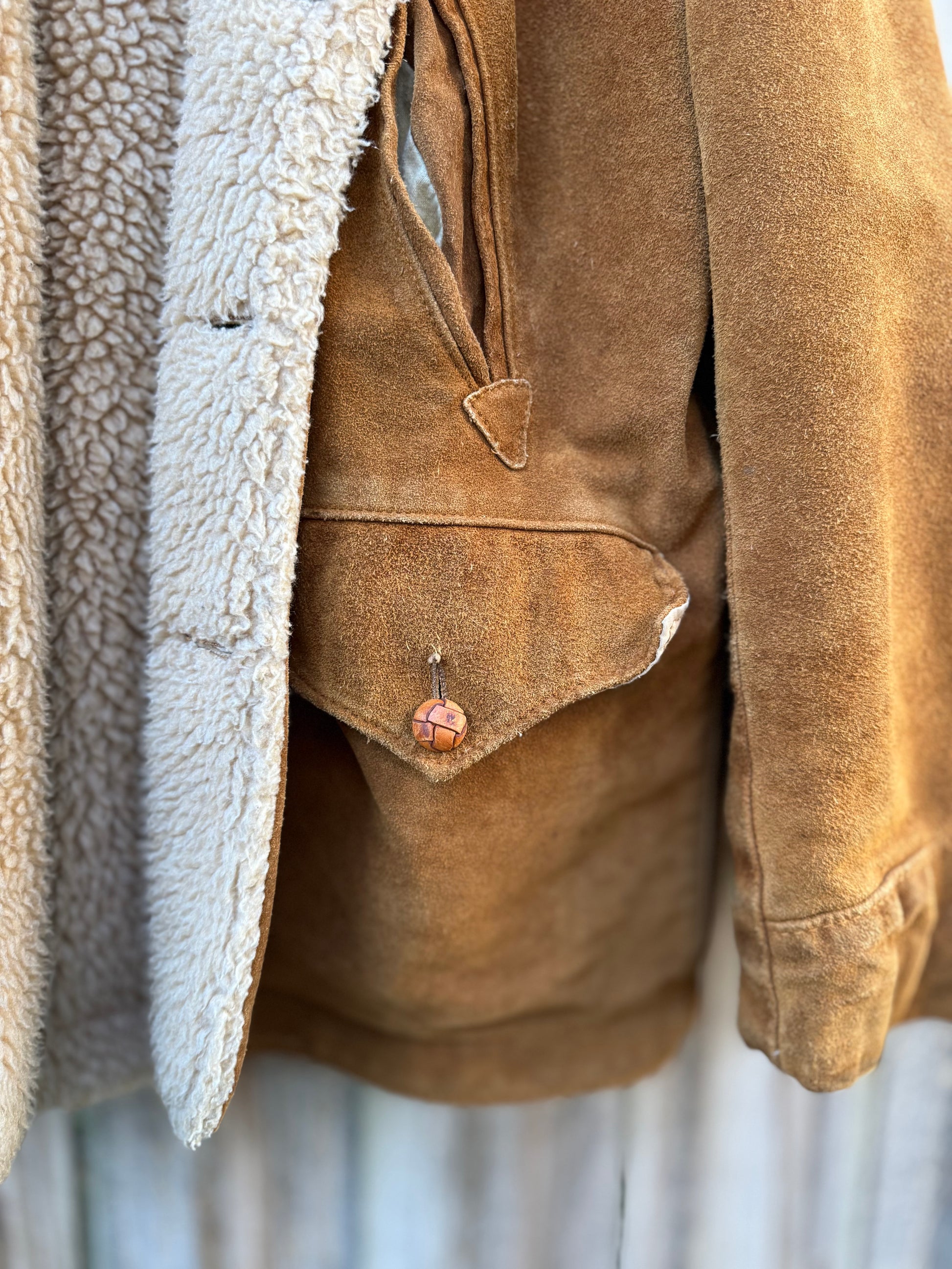 (suede shearling jacket, schott jacket, western shearling coat, ranch jacket, vintage leather, Made in USA, Ralph Lauren Collection, Filson, Levi’s Vintage Clothing)