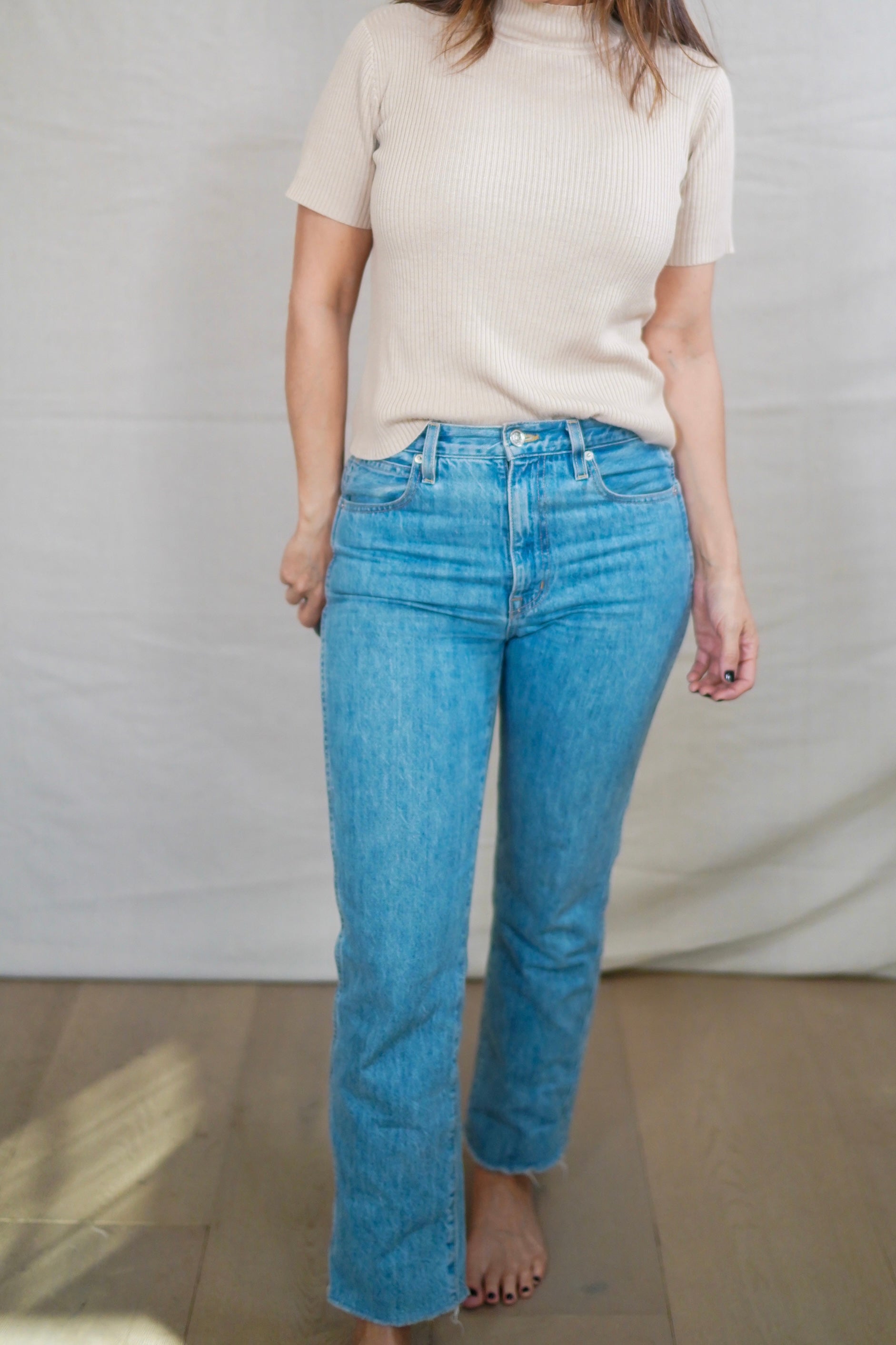 - High rise, Straight leg, Raw hem