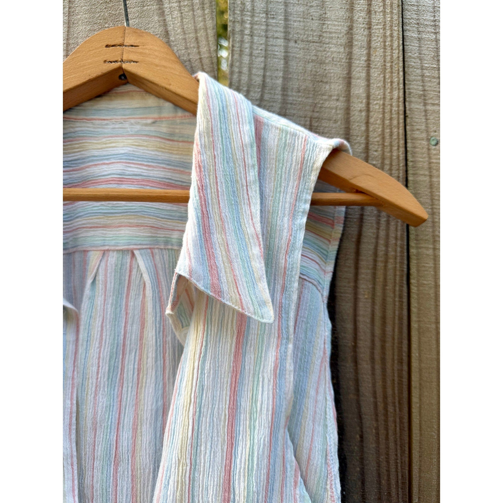 * Details: Reworked from vintage, sleeveless cut, tie-front styling option, pastel rainbow stripe
