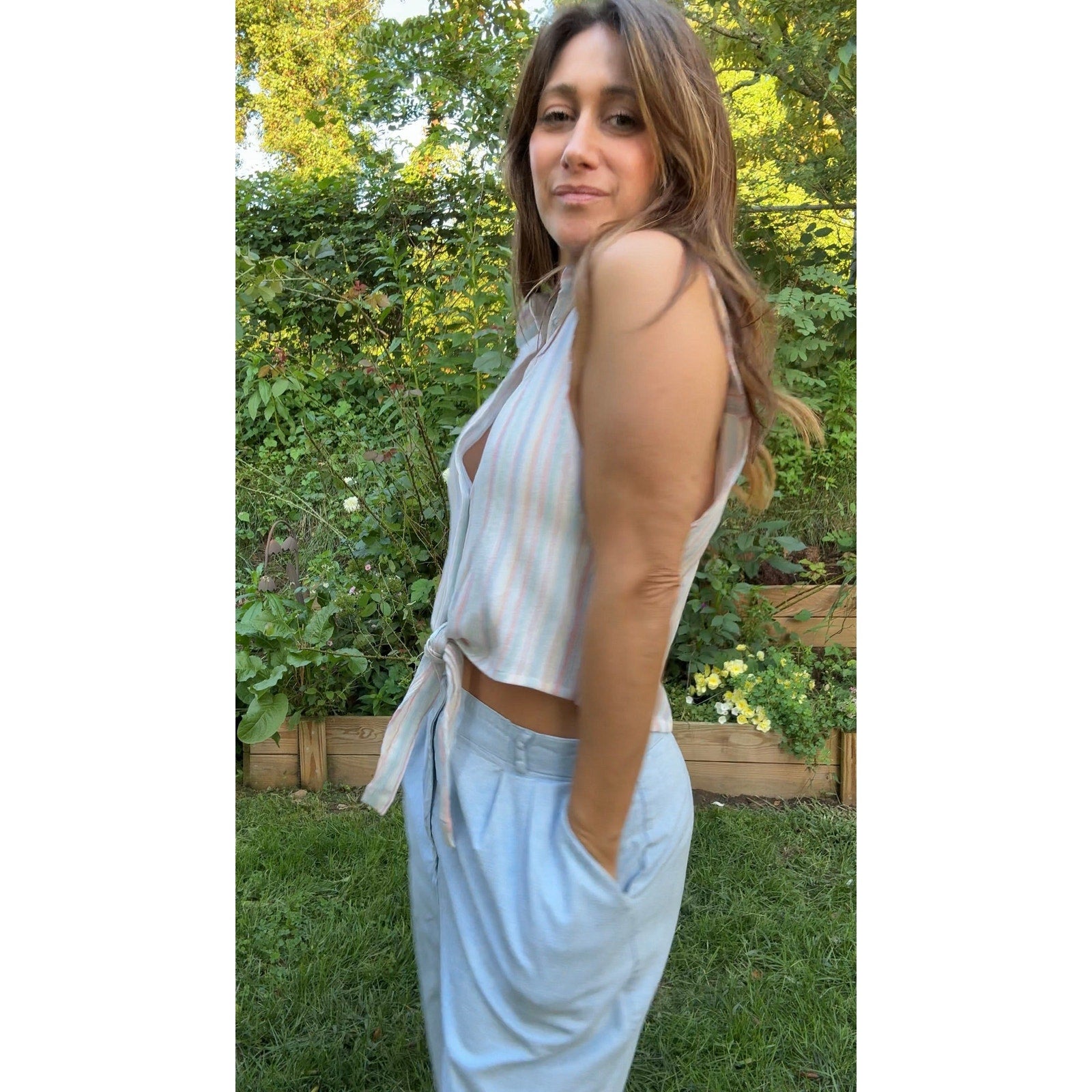 Reworked from vintage, this striped sleeveless top has that easy summer energy — rainbow sorbet stripes, light cotton gauze feel, and a knot-tie hem that makes it a natural match with denim or linen trousers. The armholes are slightly relaxed (think slouchy, not tailored), which gives it a laid-back edge.