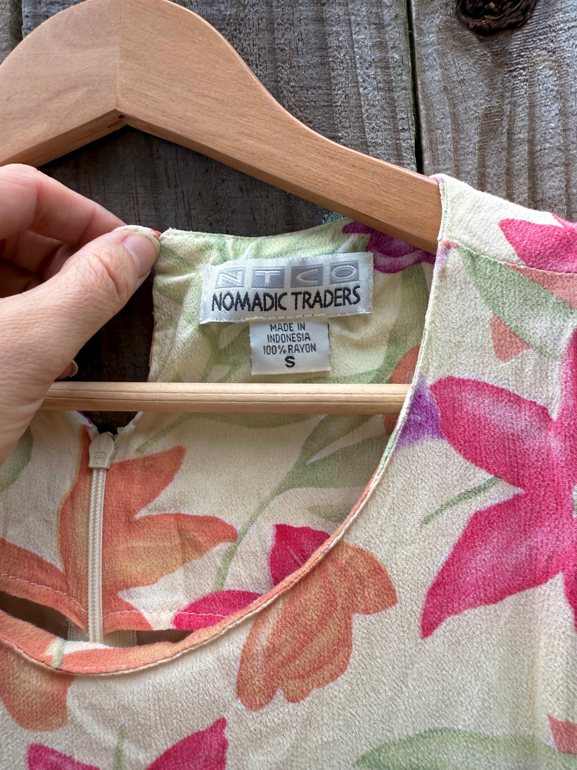 This one has that dreamy 90s slip-into-a-movie vibe — soft pastels, painterly florals, and a long column cut that moves just right. Feels effortless but polished.