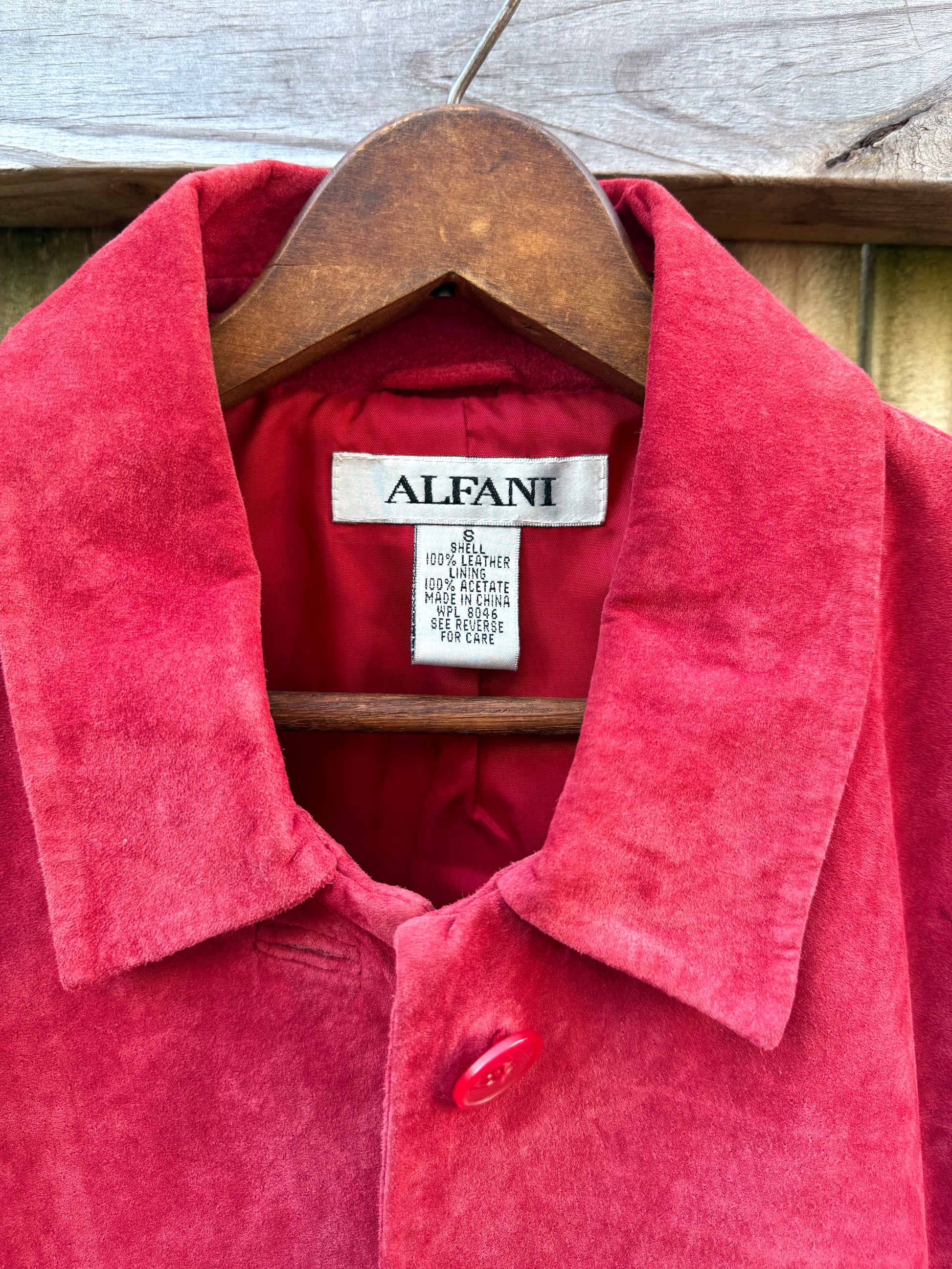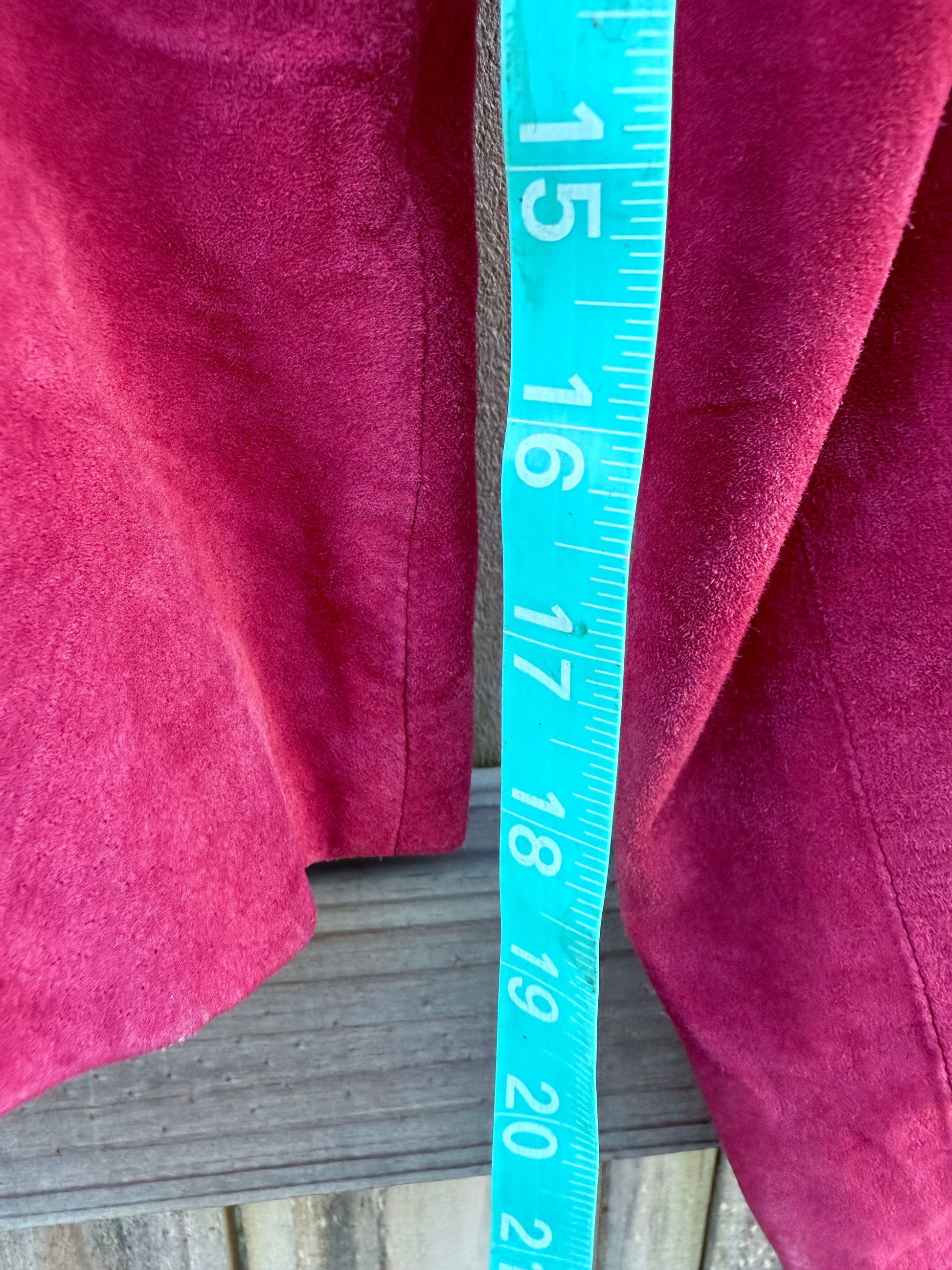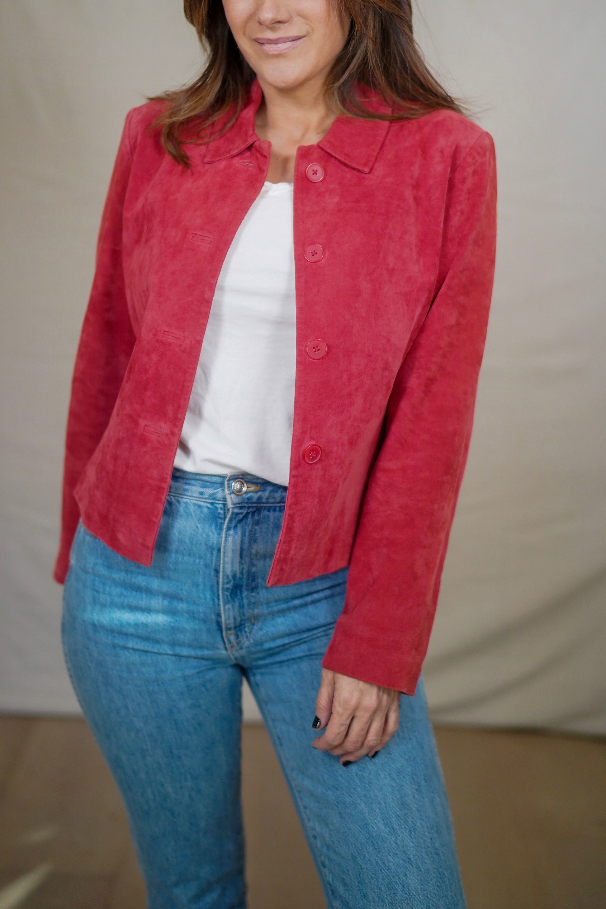 (Keywords: vintage suede jacket, cropped suede jacket, red suede jacket, berry suede, modern suede jacket, fashion outerwear, statement jacket)