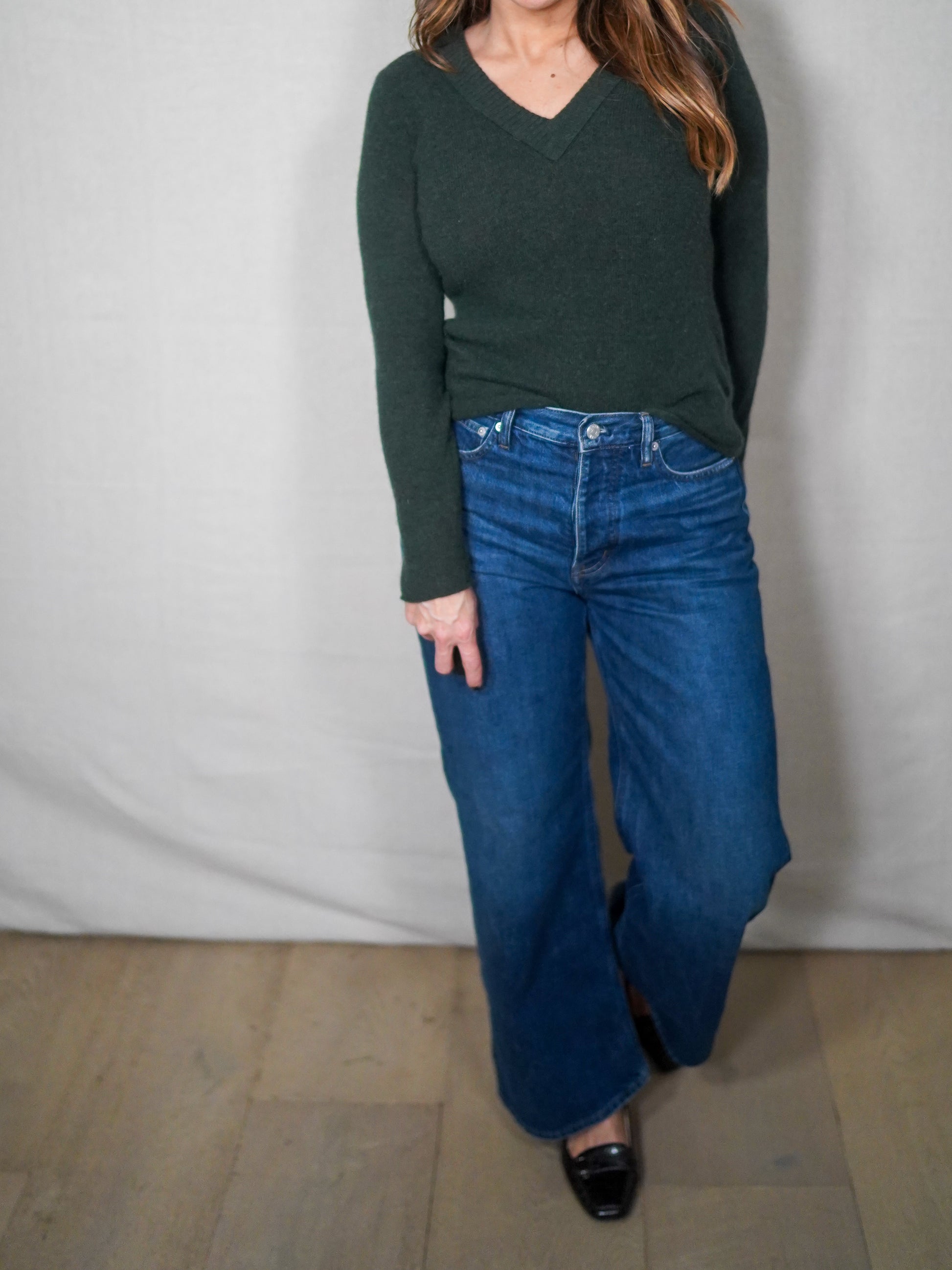 This is soft authority. Deep forest green, slim V neckline, fine-gauge knit that reads intentional, layered, quietly styled. The kind of sweater worn by women who don’t announce their taste. It shows up in the details.