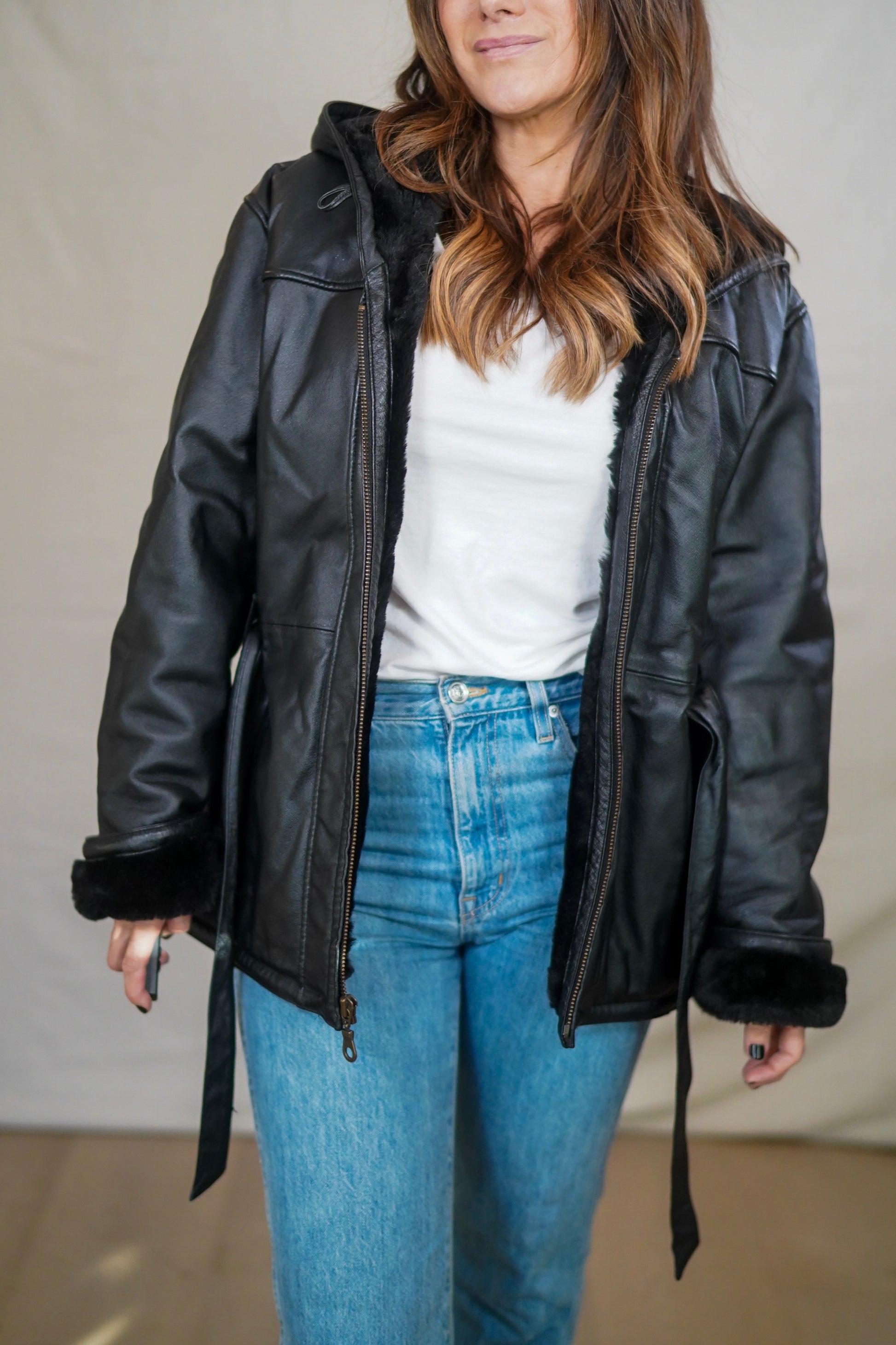 Black leather jacket with a full shearling-style lining and substantial weight. Structured through the body with a zip front, adjustable belt, and hood. The leather is thick and holds its shape. The lining adds real warmth through the body, cuffs, and hood.