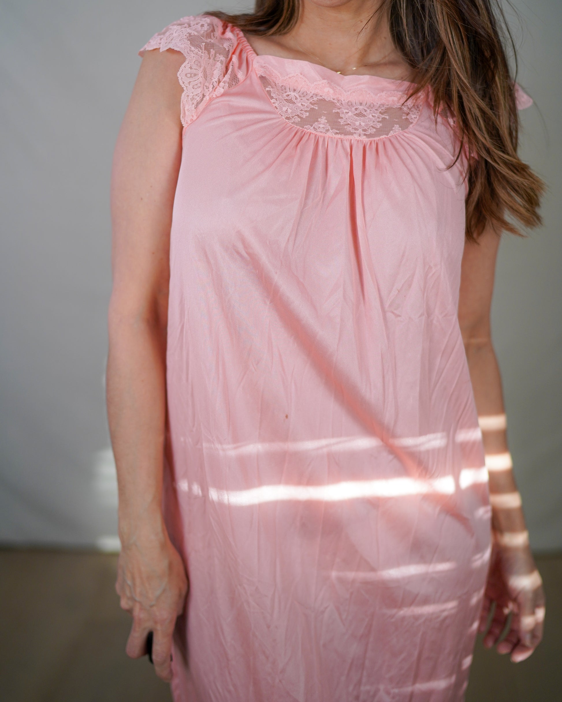 This vintage blush pink nightgown dress is soft romance with a wink: flutter lace shoulders, airy drape, and that barely-there glow that feels effortless but dangerous in the best way.