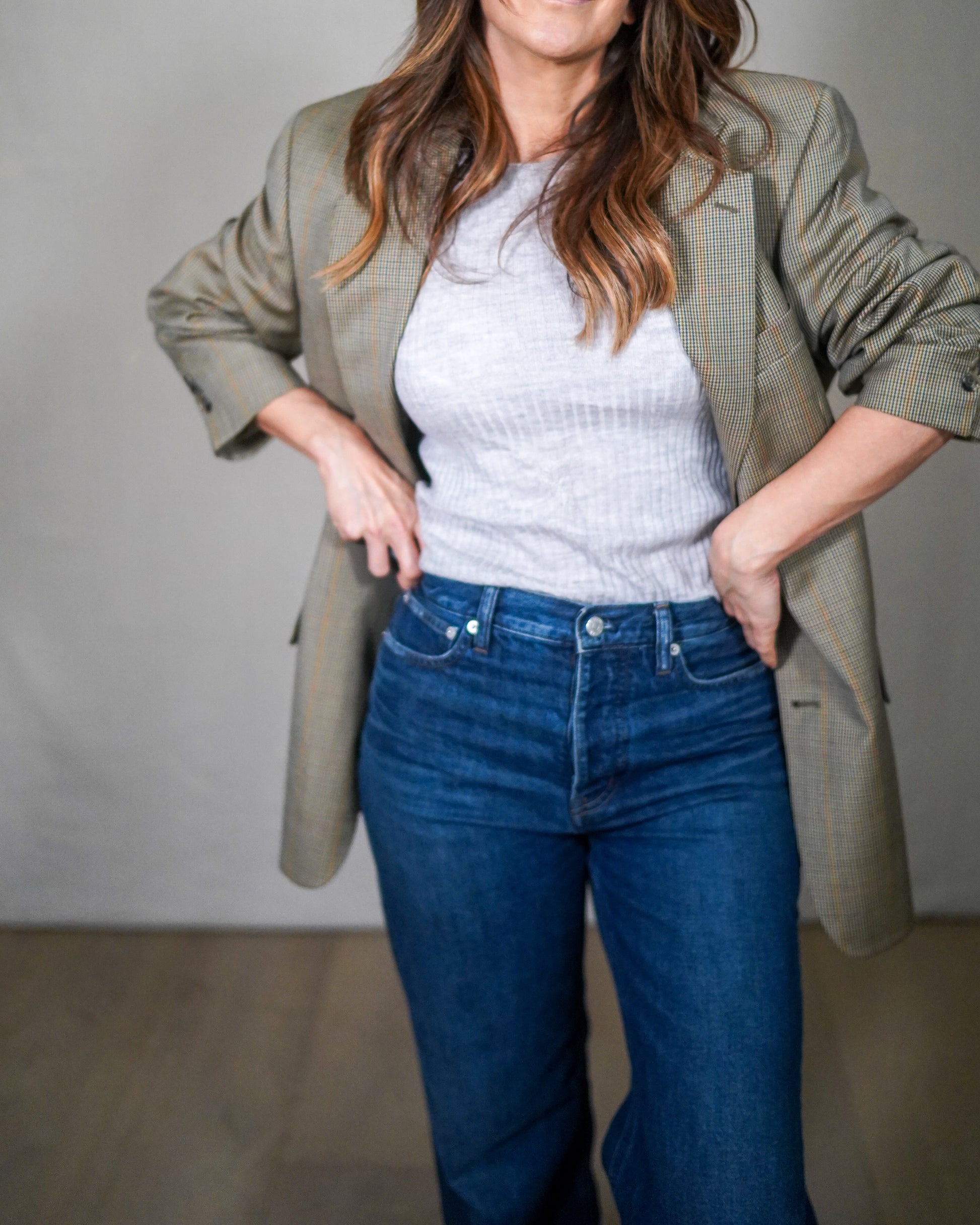 Classic wool suiting fabric with a subtle micro-check that reads neutral from a distance and rich up close. Relaxed through the body with clean shoulders and a straight, unfussy line. This is very Ralph Lauren Purple Label / The Row-adjacent energy — timeless American tailoring styled the modern way.