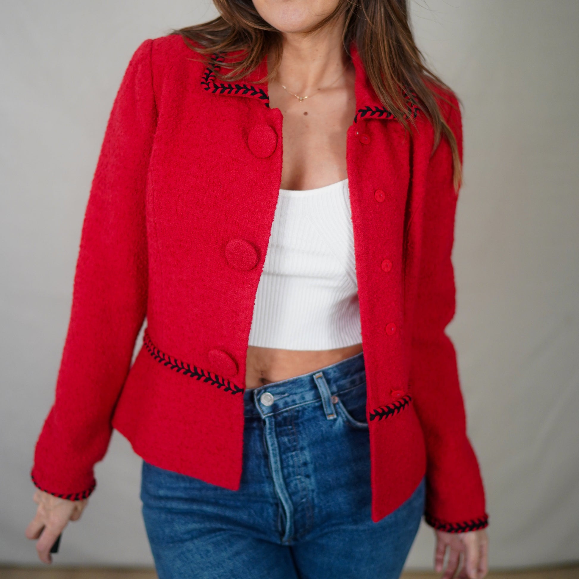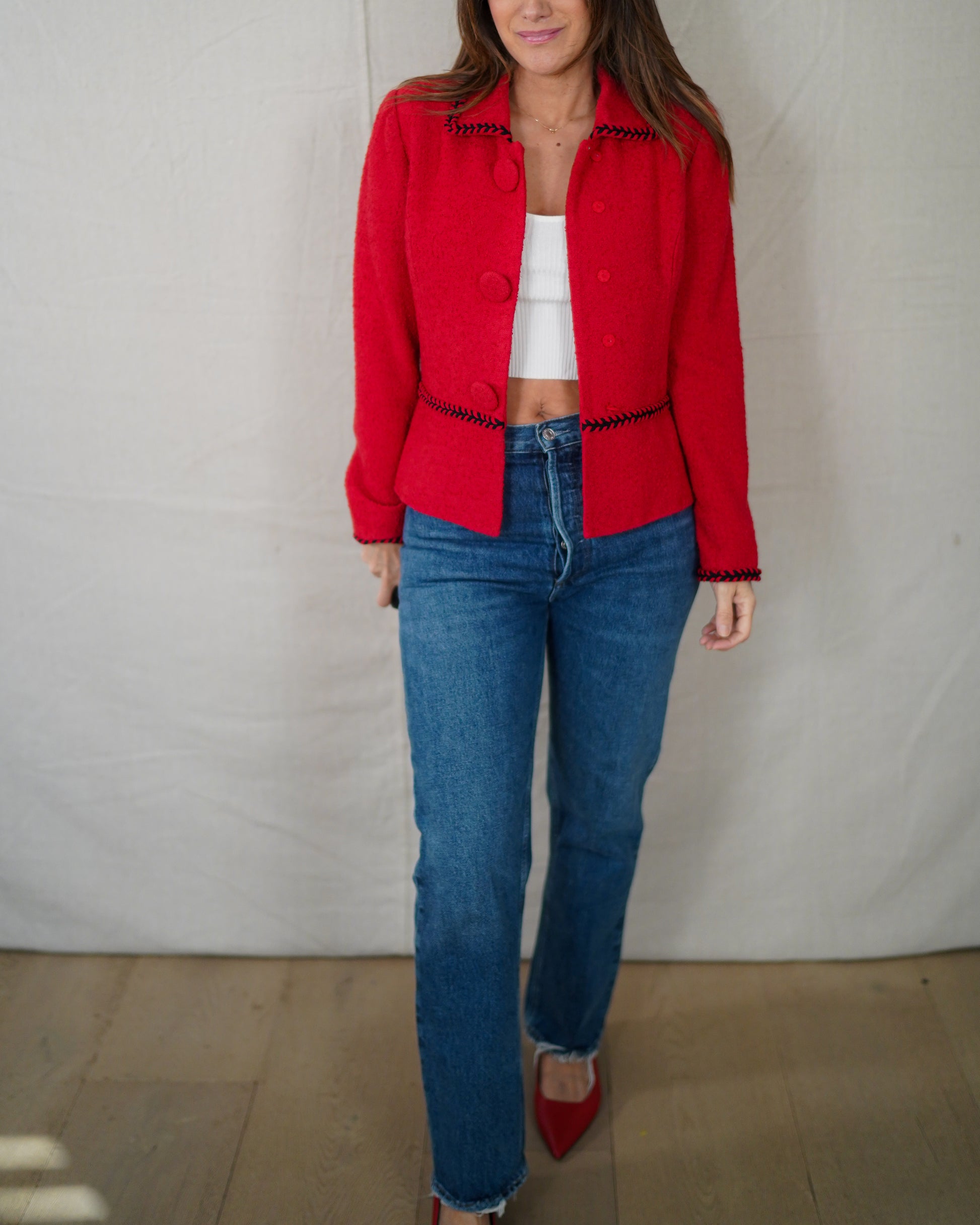 (vintage red jacket, bouclé blazer, Valentine outfit, French girl jacket, cropped vintage blazer, Sézane, Reformation, Rouje)