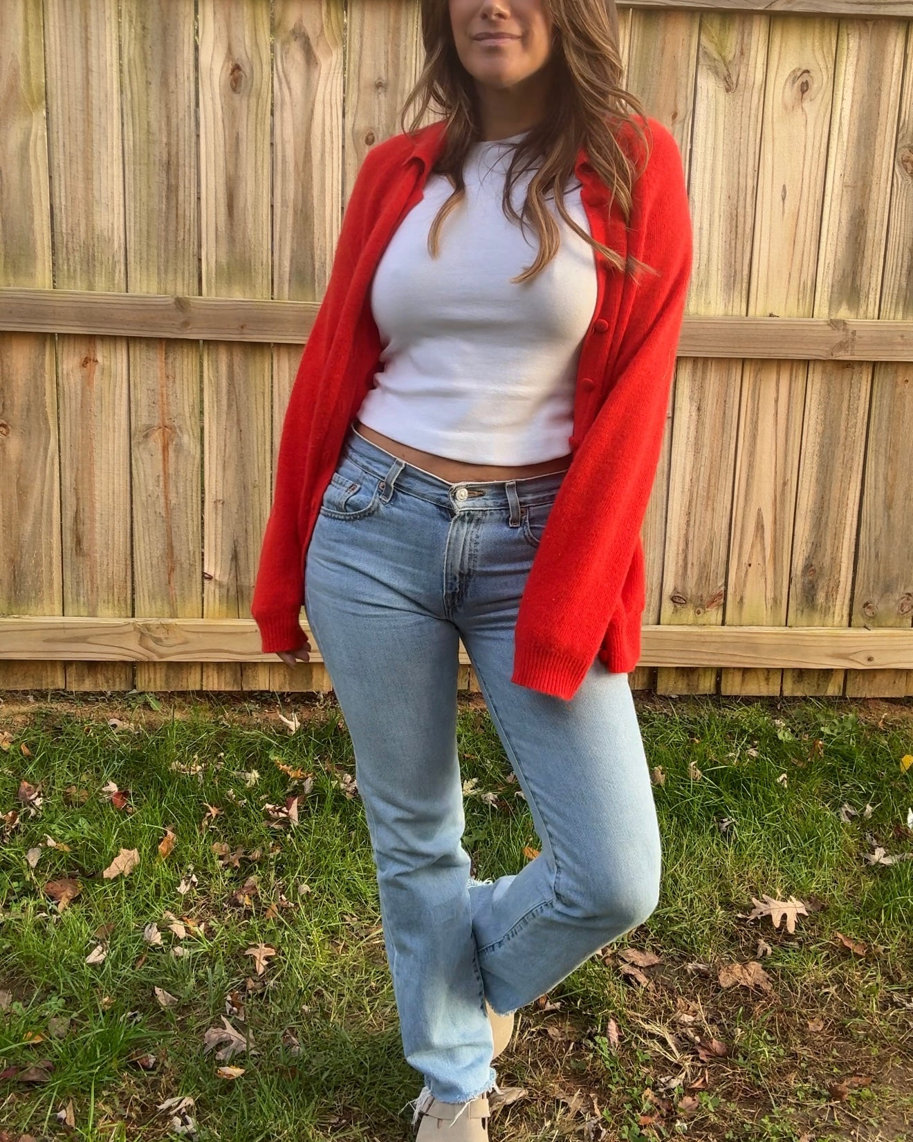 (vintage cardigan, angora knit, red wool sweater, 90s minimalism, French girl style, adjacent brands: Sezane, Aritzia, Ralph Lauren)
