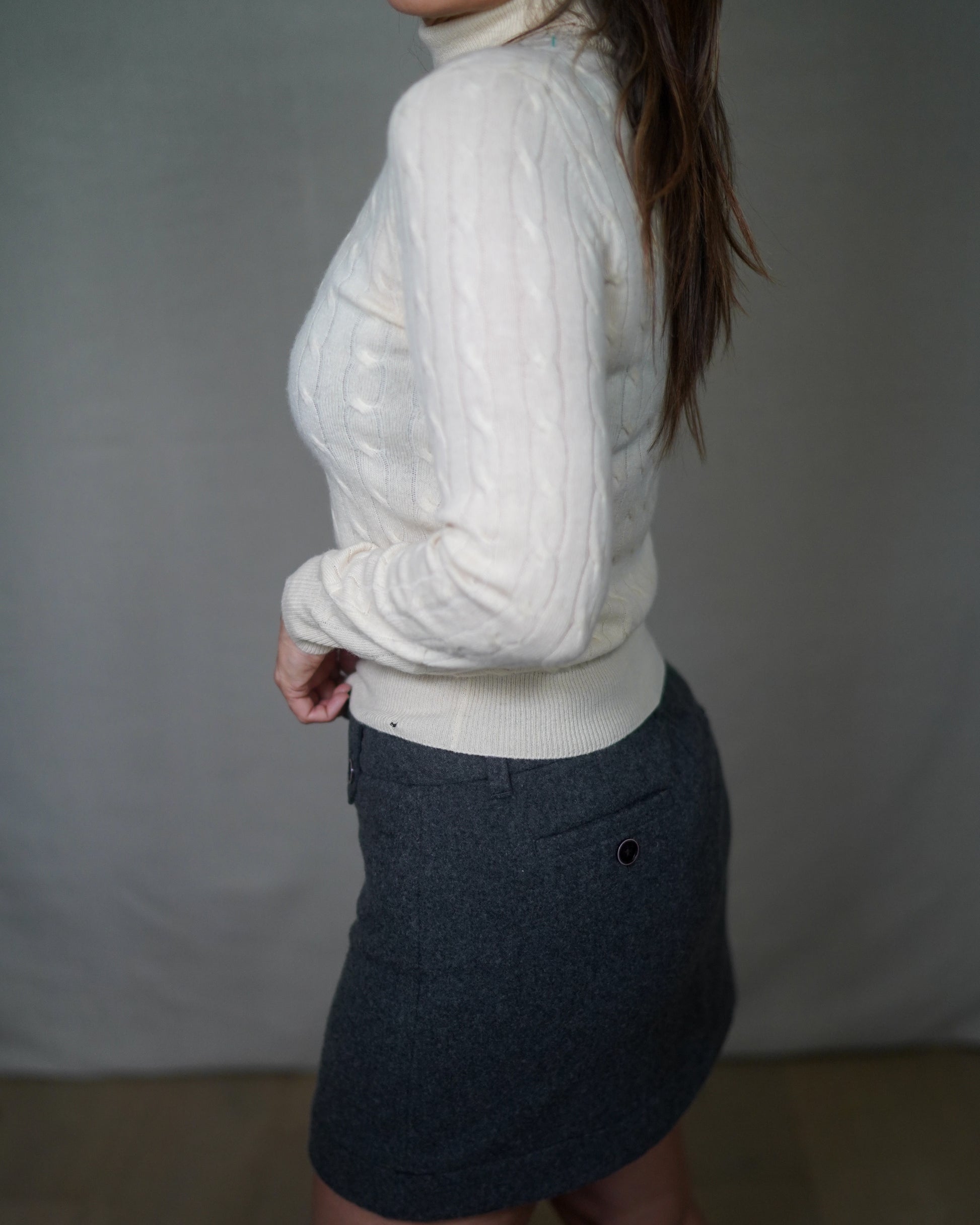 Designed to sit close to the body with a clean mock neckline and subtle cable texture. Wear it tucked into tailored trousers, styled with wool minis, or layered under a coat for that effortless off-duty feel.
