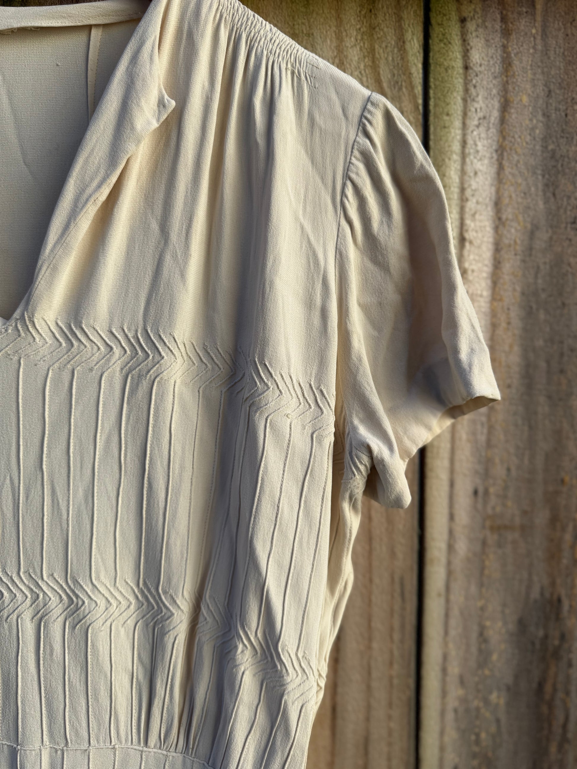 Beautiful vintage estate dress in a soft cream tone with subtle textured detailing at the bodice and waist. Effortless drape with a refined, romantic feminine silhouette. A true quiet luxury piece that dresses up or down with ease.