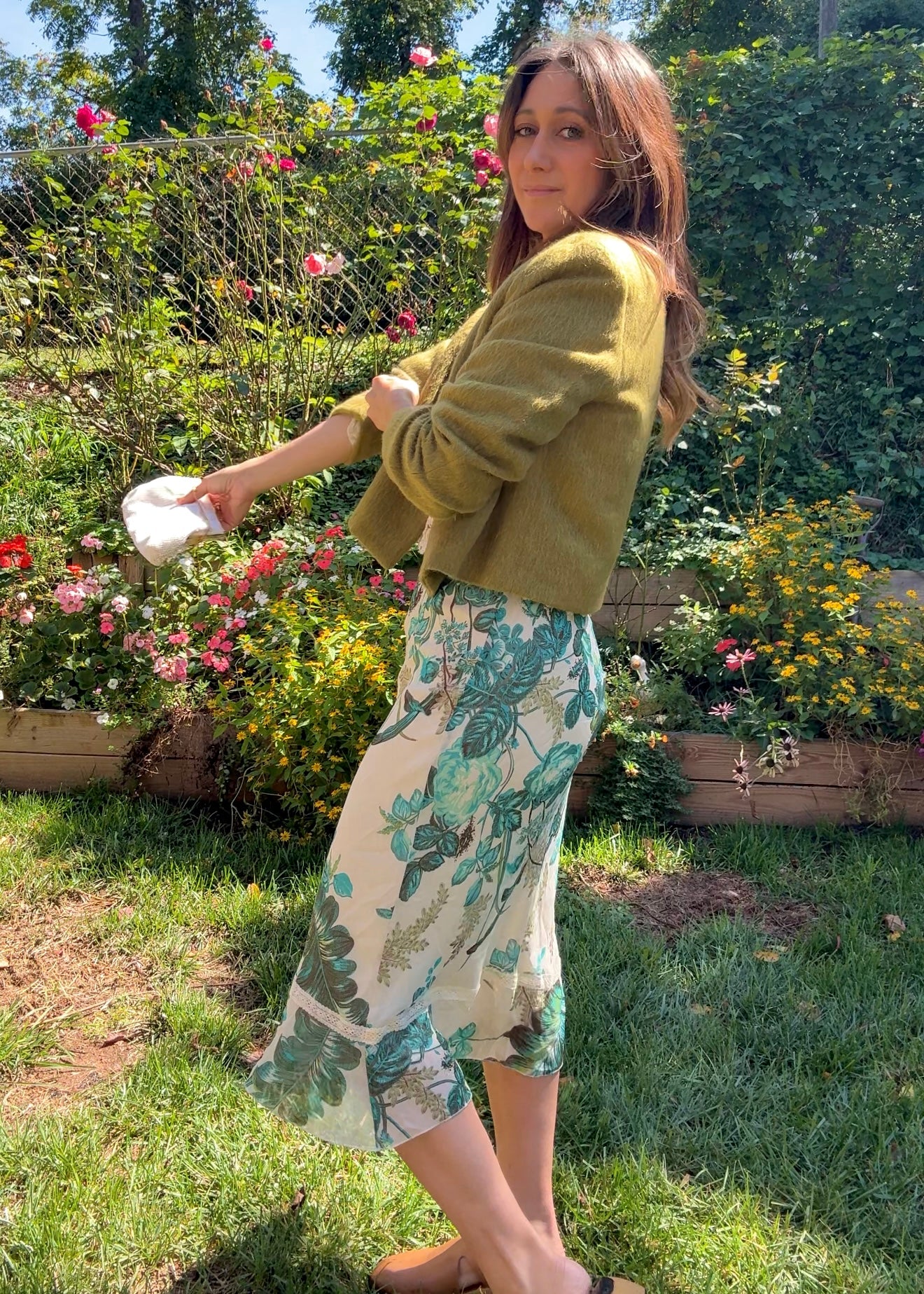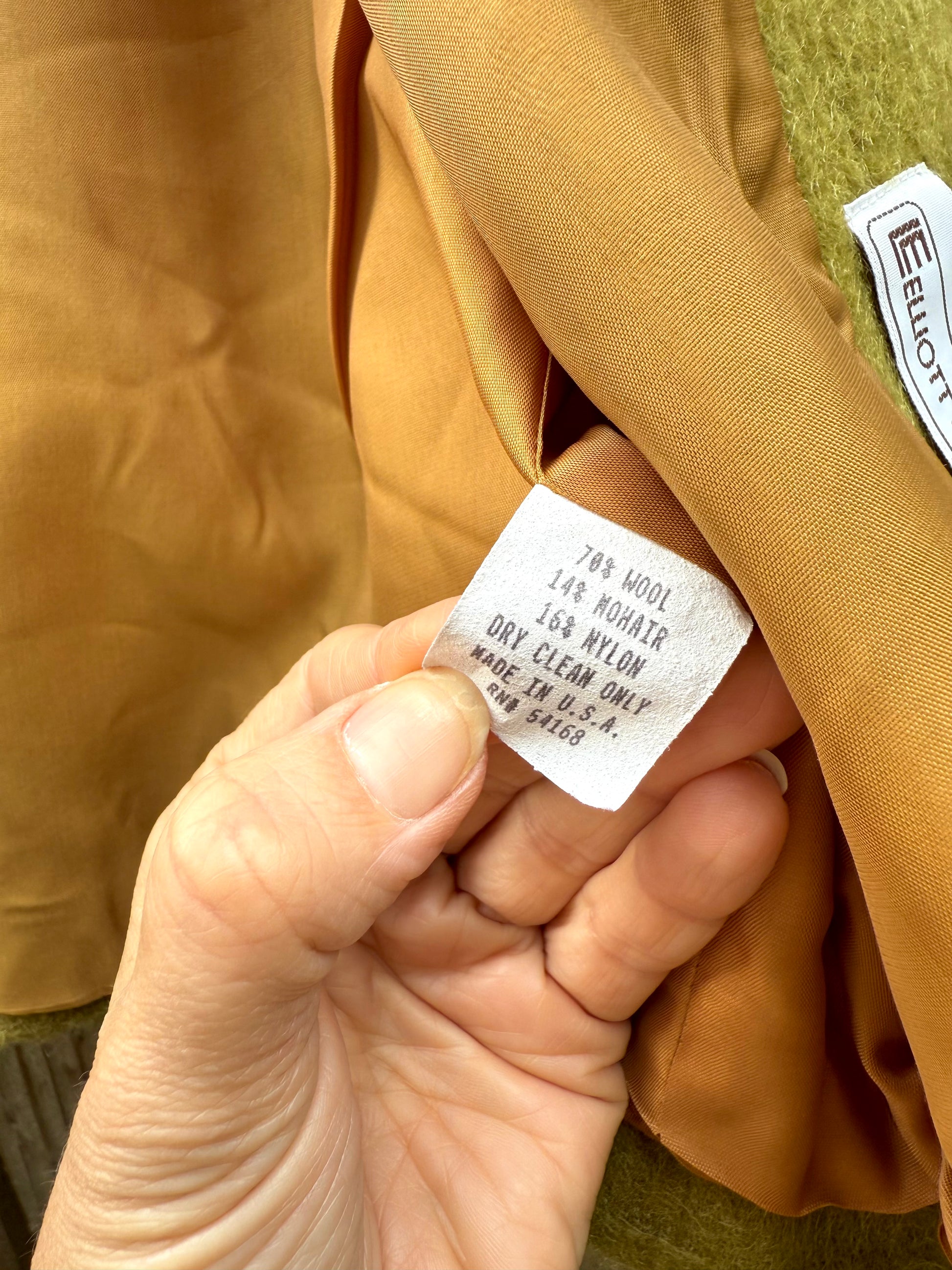 We pulled this vintage Elliott Lauren jacket for its incredible fabric and color — a mohair-wool blend in a mossy olive that feels both timeless and on-trend. The cropped, collarless cut gives quiet luxury energy, like something you’d see layered over denim on the streets of Paris or styled with silk trousers for a 90s runway nod.
