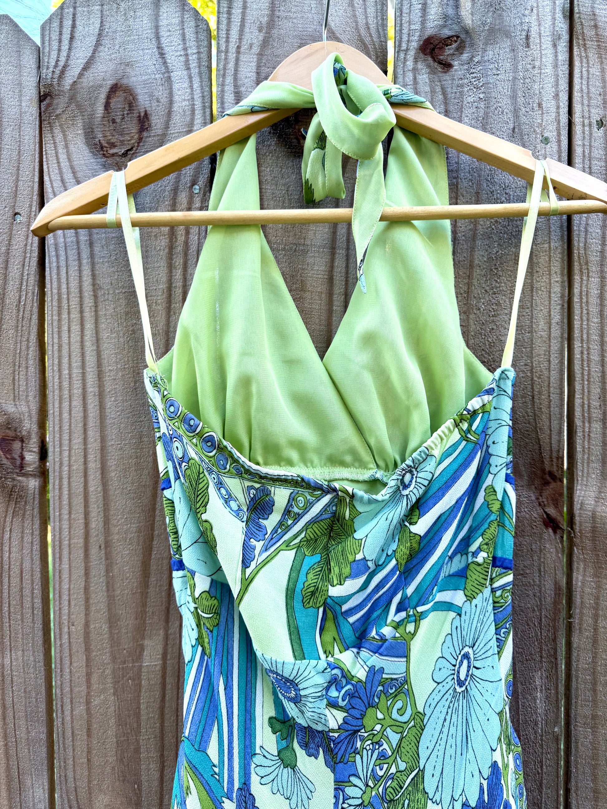 Vintage halter slip dress in lagoon blue + lime abstract floral — fits XS