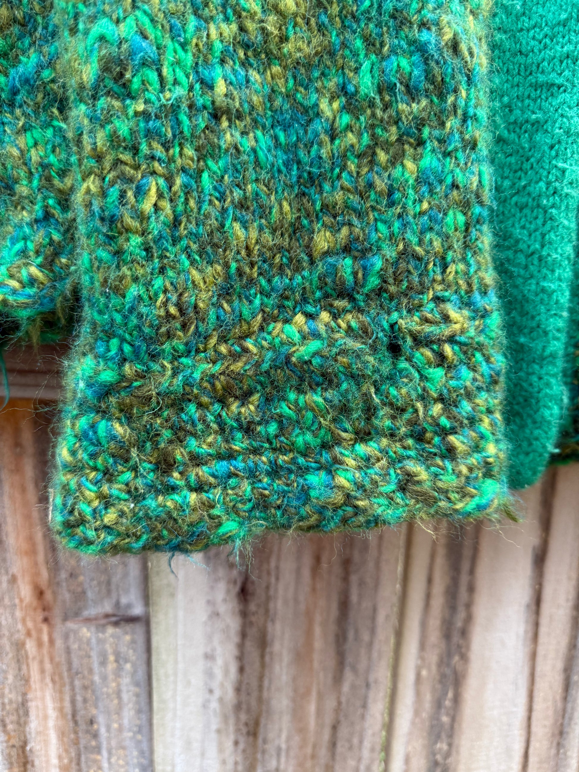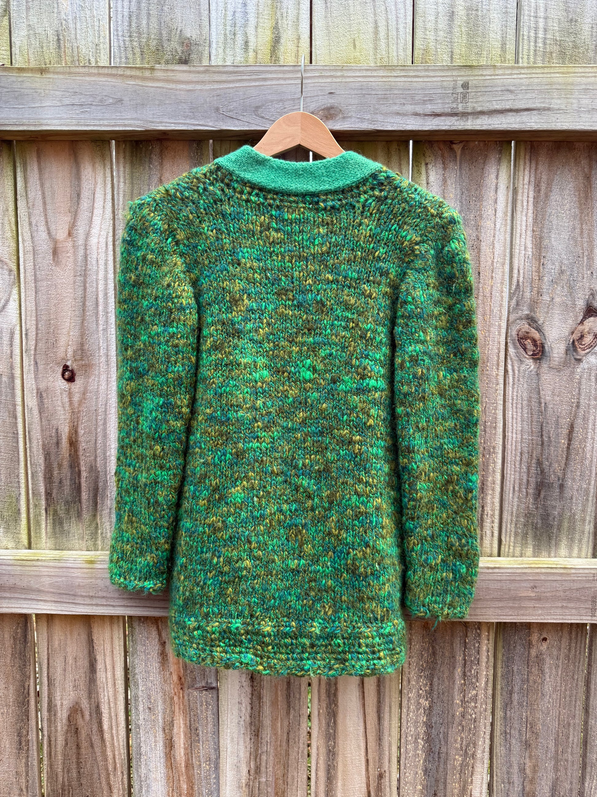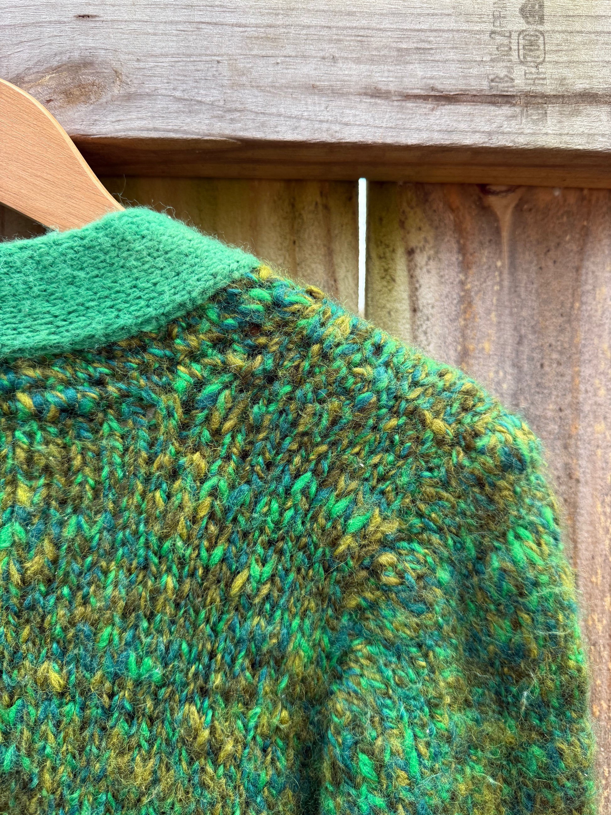 Vintage Hand-knit vintage cardigan signed by Gladys Massey, made in a rich variegated green wool with a contrasting trim that gives it a really elevated texture.