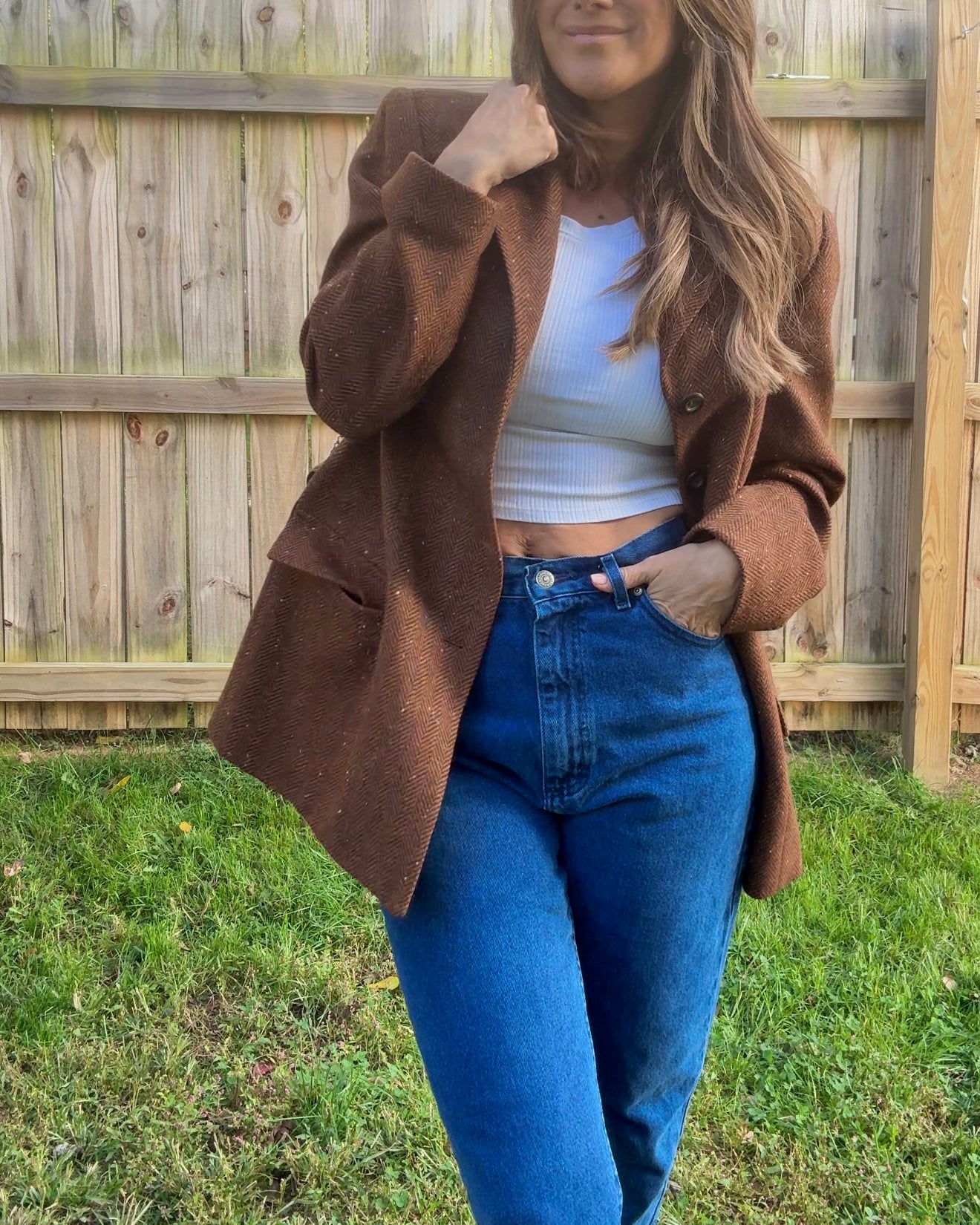 I almost kept this for myself — it feels like a forever blazer. The drape, the structure, the depth of the brown… it reads quiet luxury in the way only real vintage can.