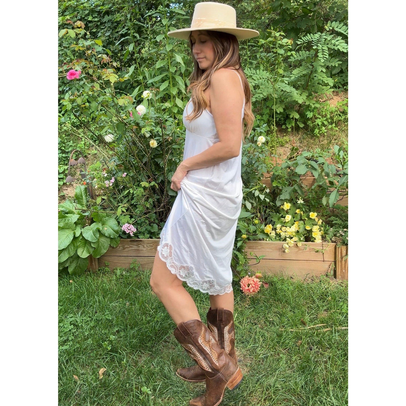 A vintage ivory slip with delicate lace panels, styled for the Mesa Moon collection — inspired by desert nights, festival lights, and the new western energy. The lace trim and fluid drape give it that romantic edge, while boots and a shearling coat lean western. At the same time, it’s fully Carrie Bradshaw-coded for a night out — the kind of effortless slip that moves from streets to cocktails with the right styling.