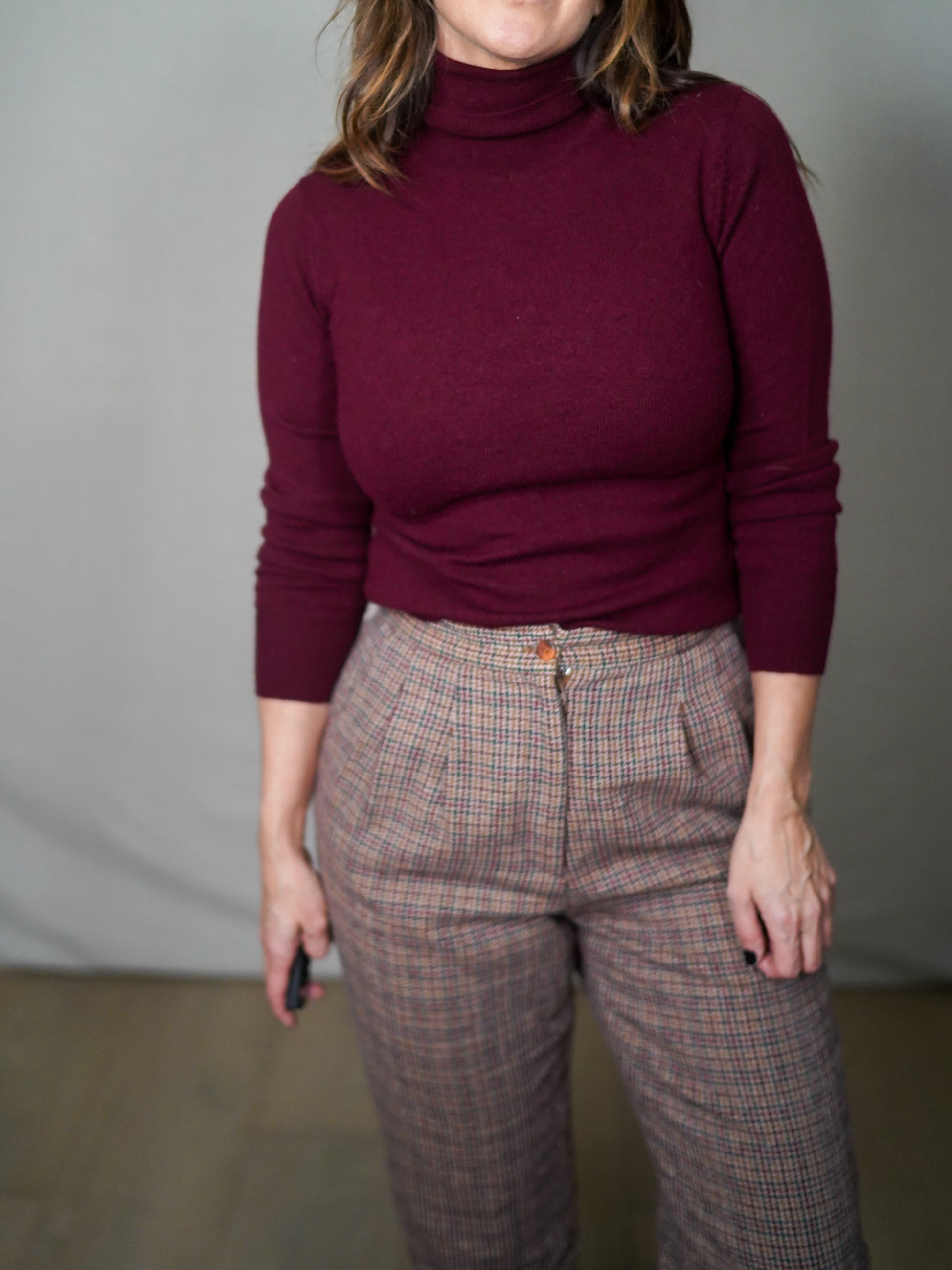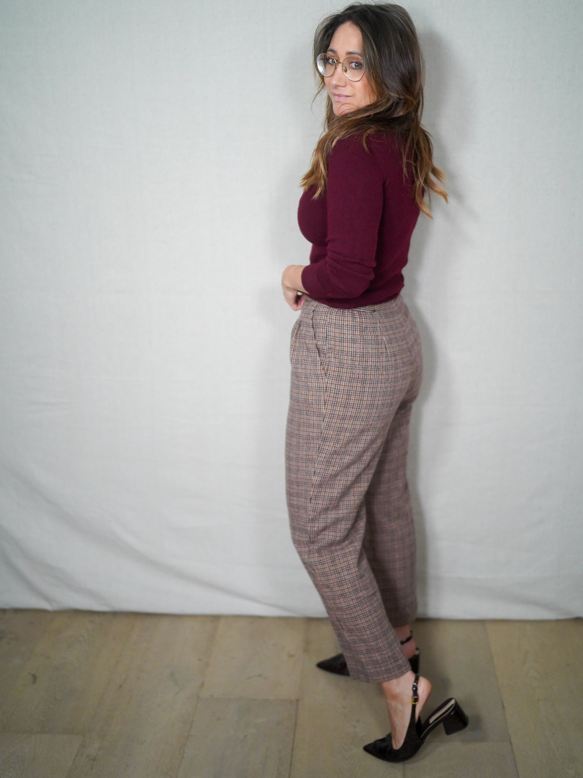 Muted brown plaid with subtle wine and forest threads, structured but relaxed through the leg. This is the kind of trouser that makes everything else in your closet look intentional. You put these on and suddenly your coffee run outfit reads “editorial errand.”