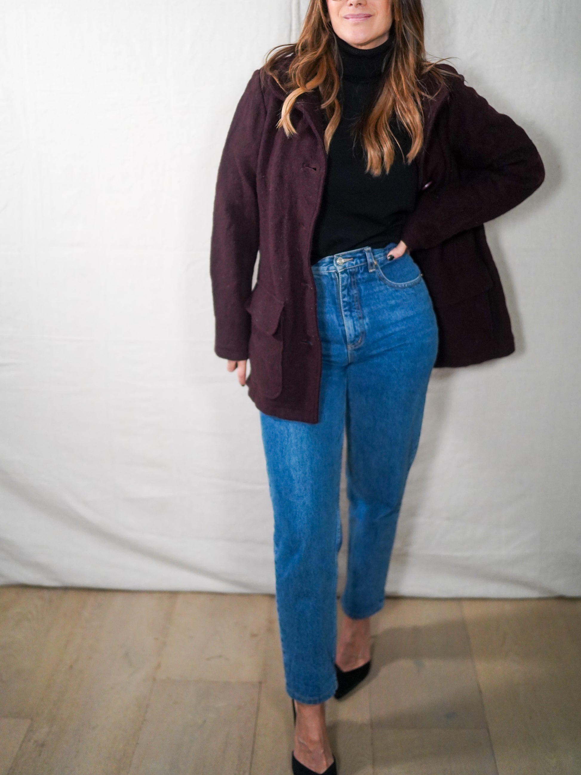 Deep wine-burgundy Italian wool with that quiet, intellectual outerwear energy. The kind of piece that signals taste without trying. Structured but soft, tailored without feeling corporate. Reads Paris café, gallery opening, long-walk-through-a-European-city energy.