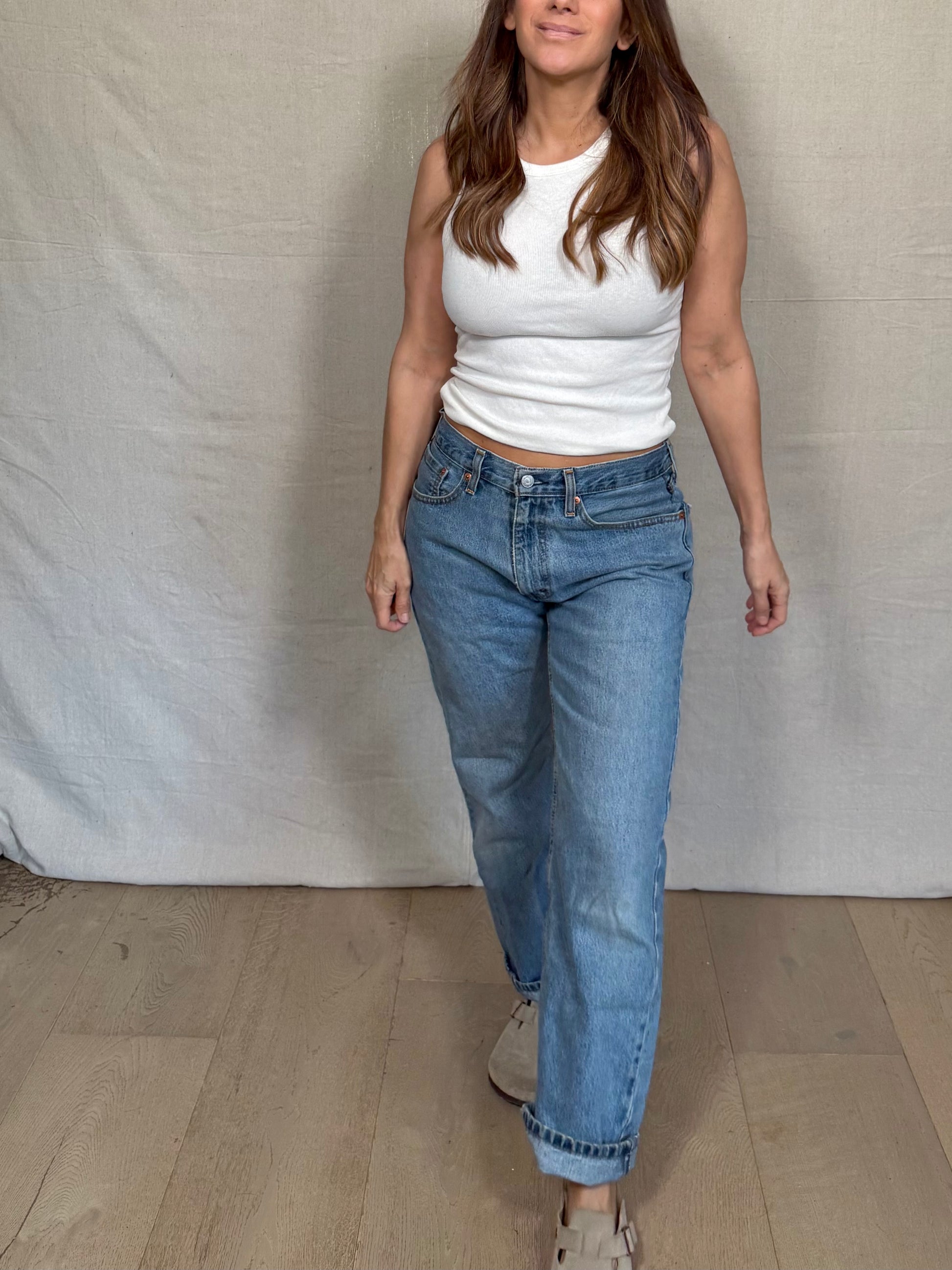 Mid-rise fit with authentic vintage wear, natural fading, and that unmistakable Levi’s drape that only comes with time. Designed to sit easy on the hips, stack just right at the ankle, and style endlessly — tanks, knits, boots, loafers, Birks.