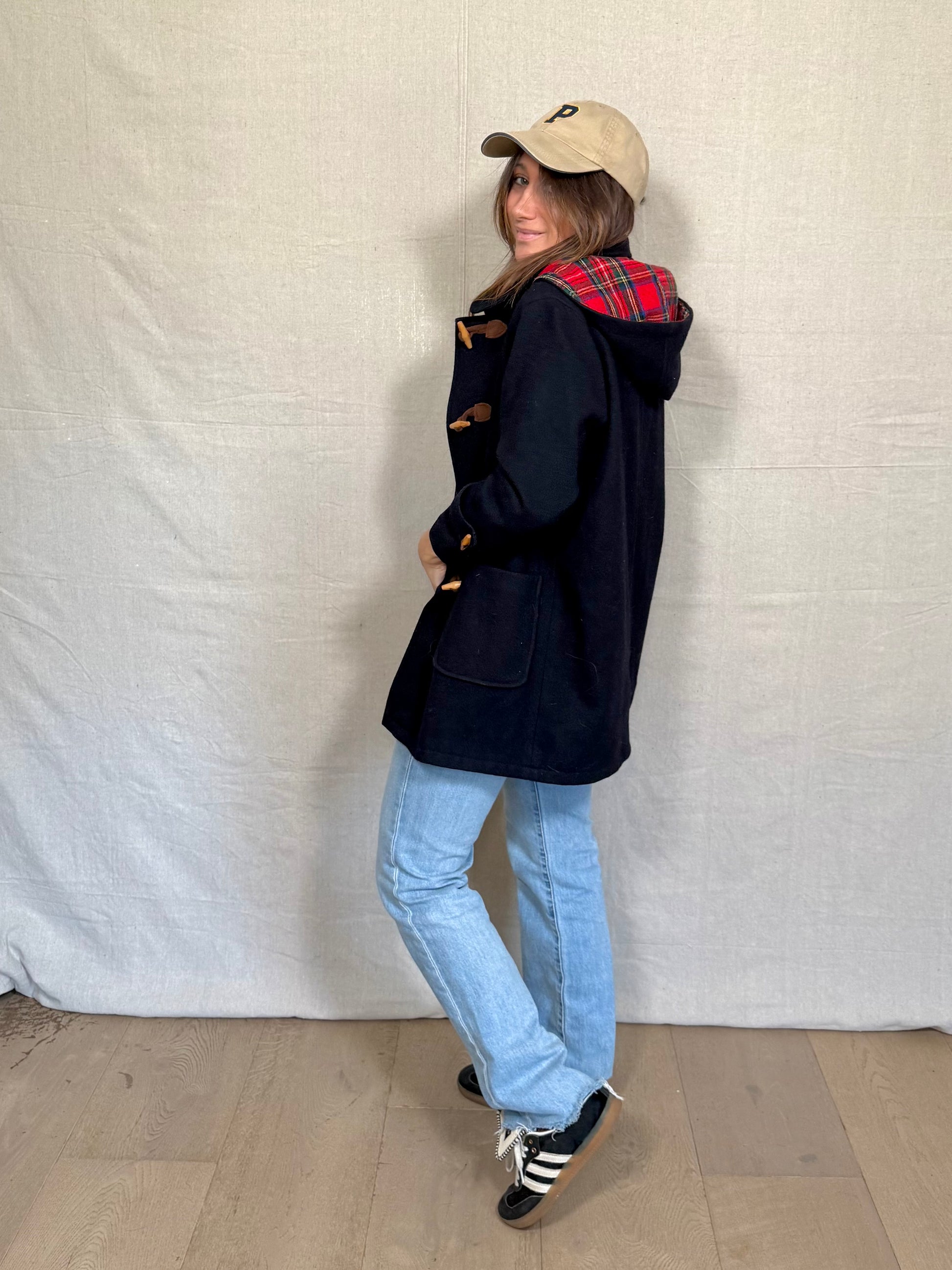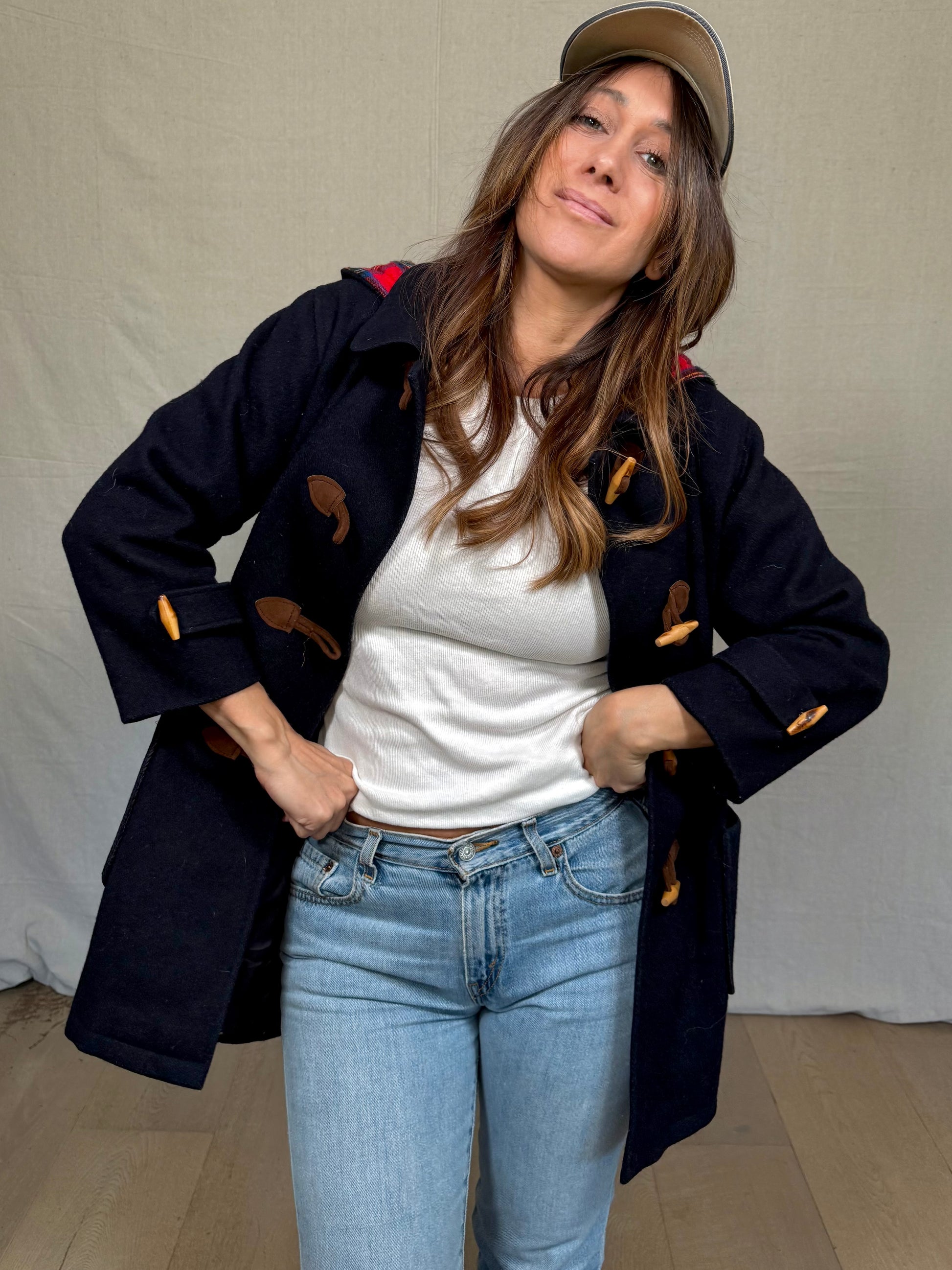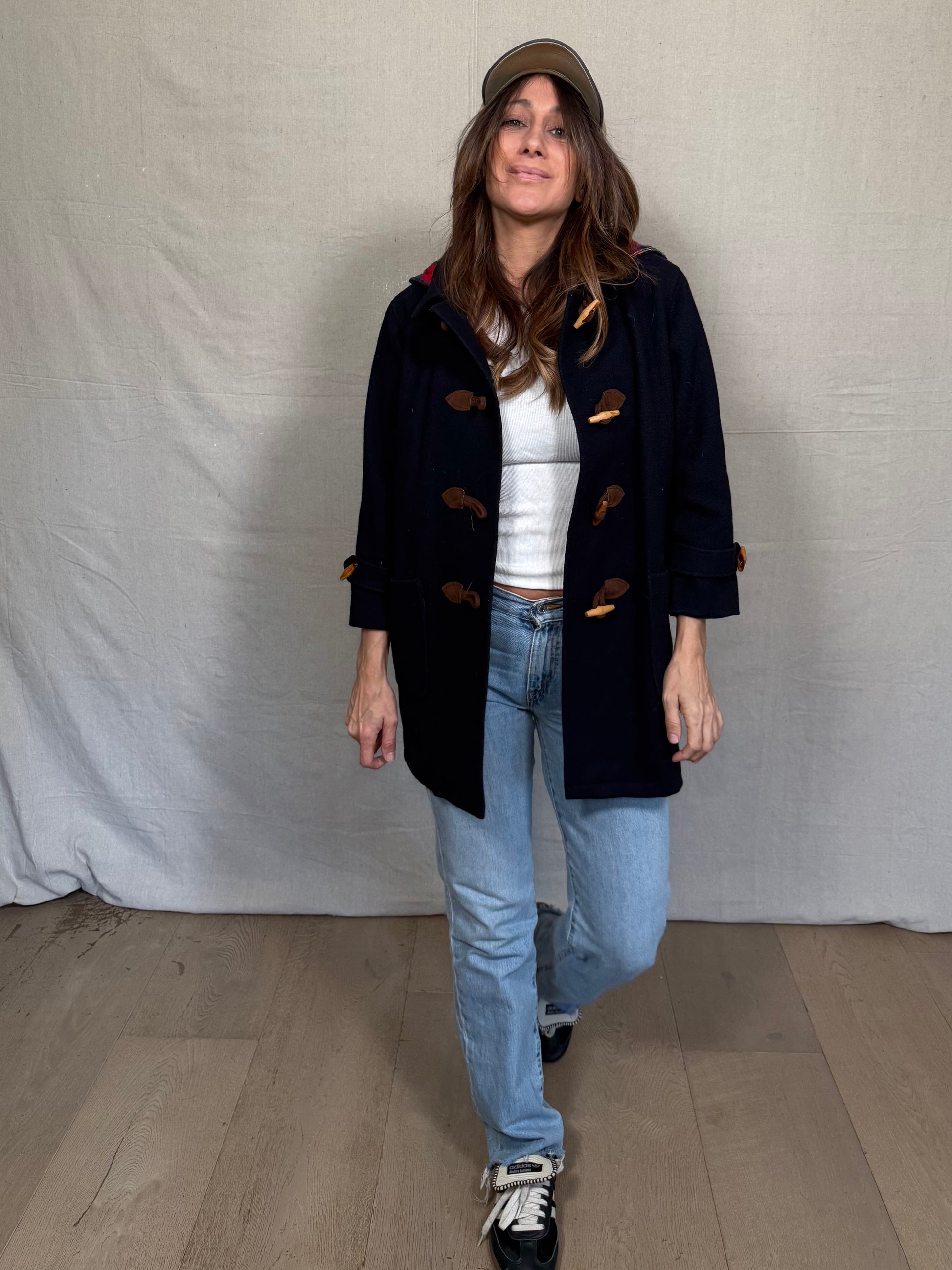 Classic navy duffle with real toggle closures and a softly structured shape that wears surprisingly modern. The proportions are slightly cropped and neat through the body, which is why this works so well styled on a petite or XS frame without feeling bulky or costume-y.